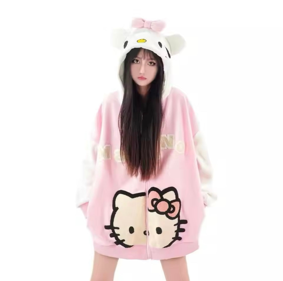 The hoodie features an oversized fit with a cute Hello Kitty face and bow embroidered design on the front.