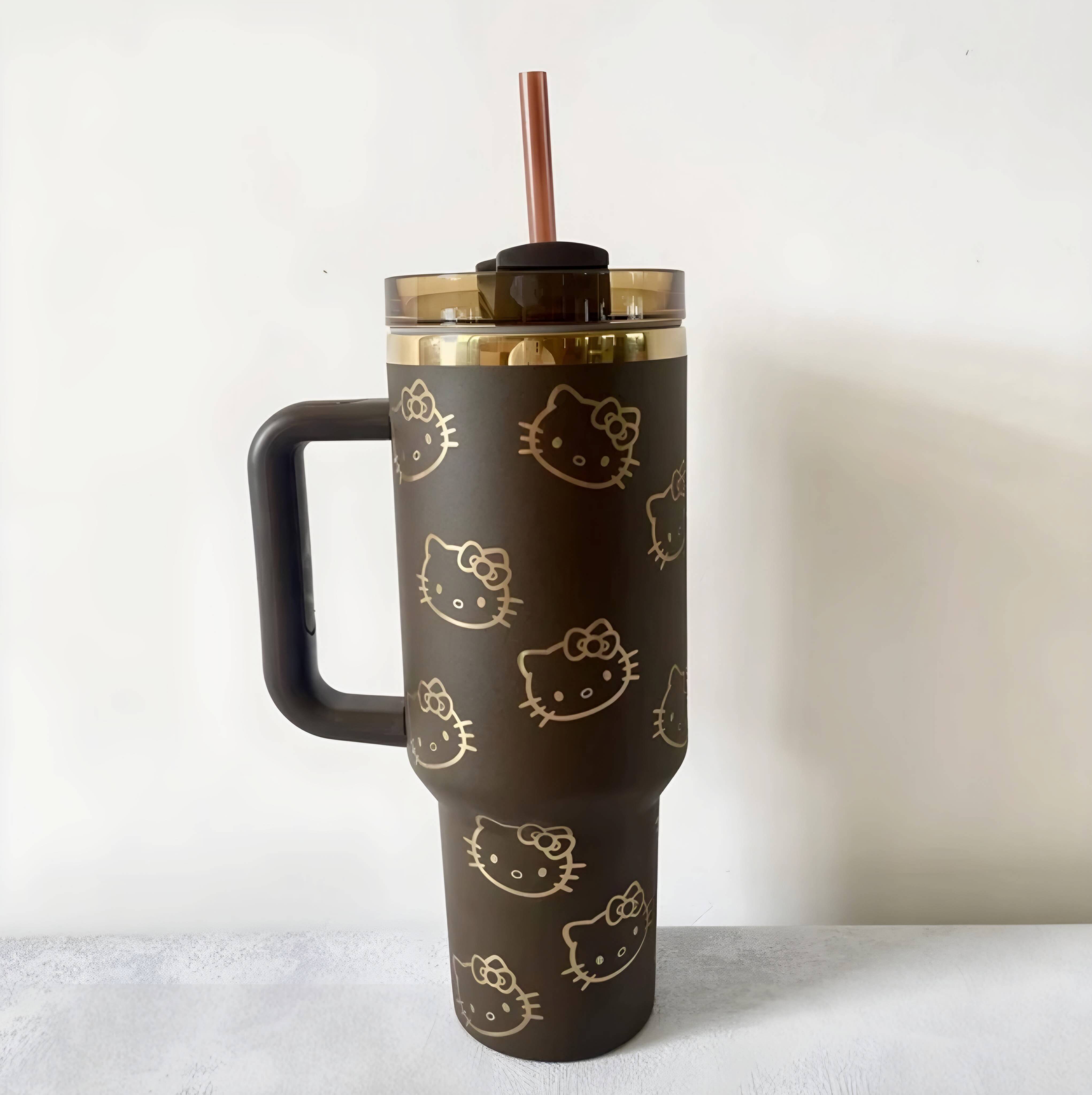 The Hello Kitty stainless steel tumbler includes a screw-on lid and slide opening for convenient sipping.