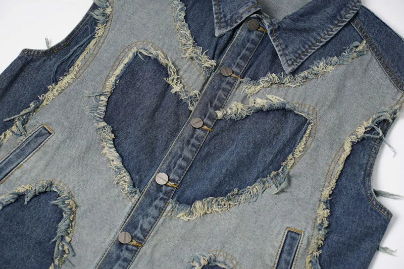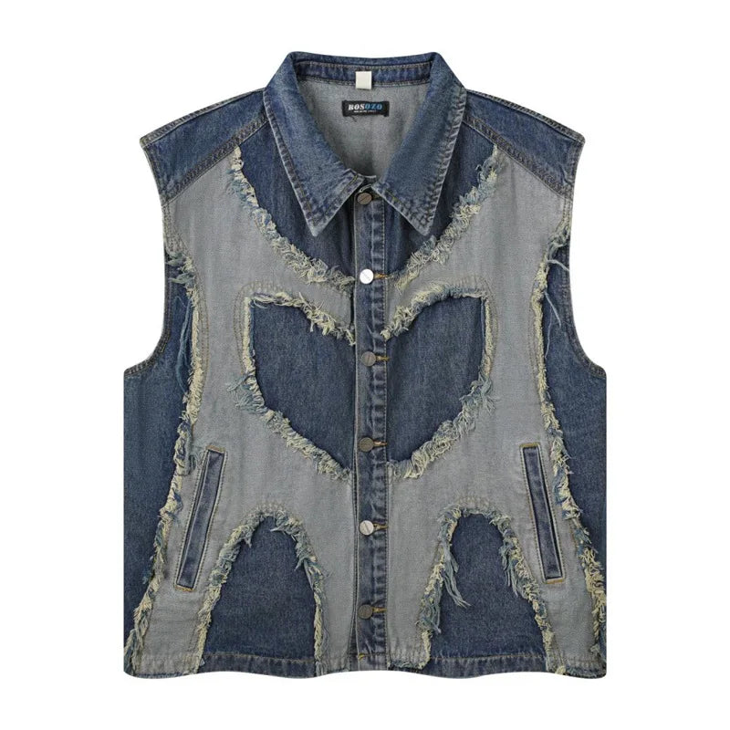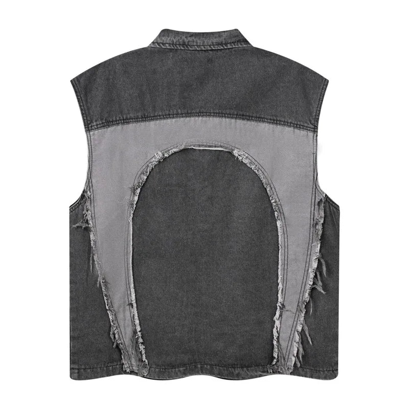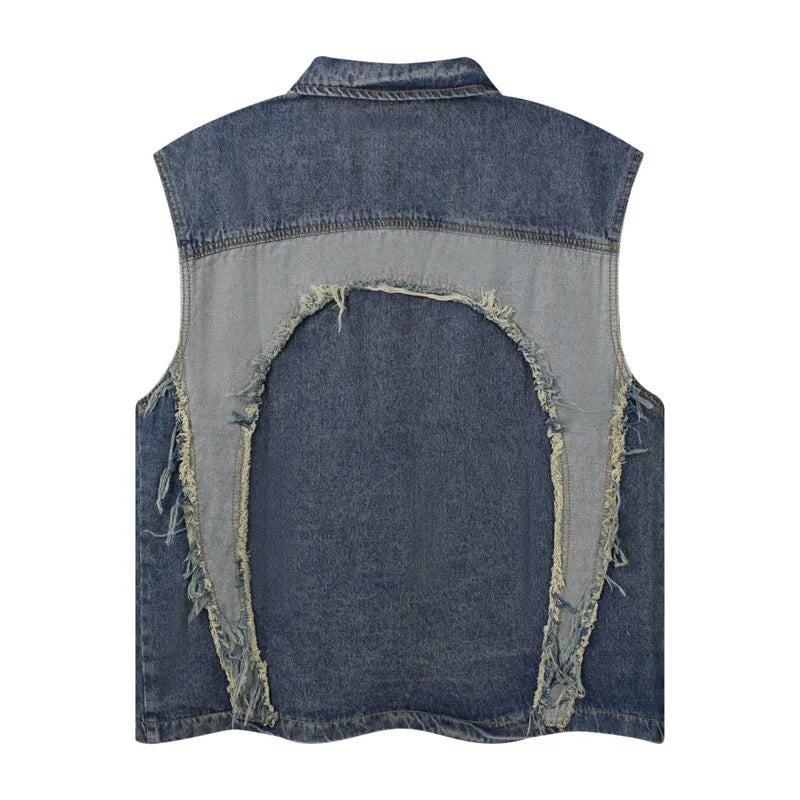 The High Street Washed Raw Edge Denim Vest combines urban style with rugged detailing. Featuring a washed finish and raw edges. this vest offers a bold. unfinished look. perfect for adding a street-ready. edgy vibe to your outfit.