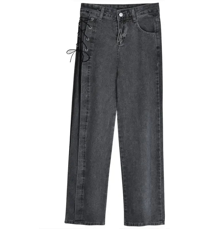 The High waist side lace-up jeans are a trendy and stylish option that combines the flattering silhouette of high-waisted jeans with the unique detail of side lacing.