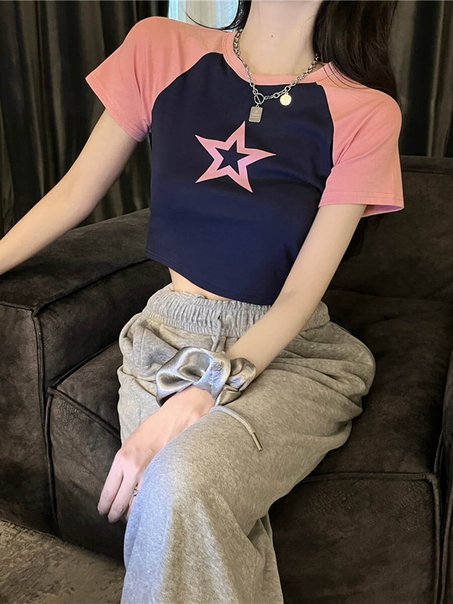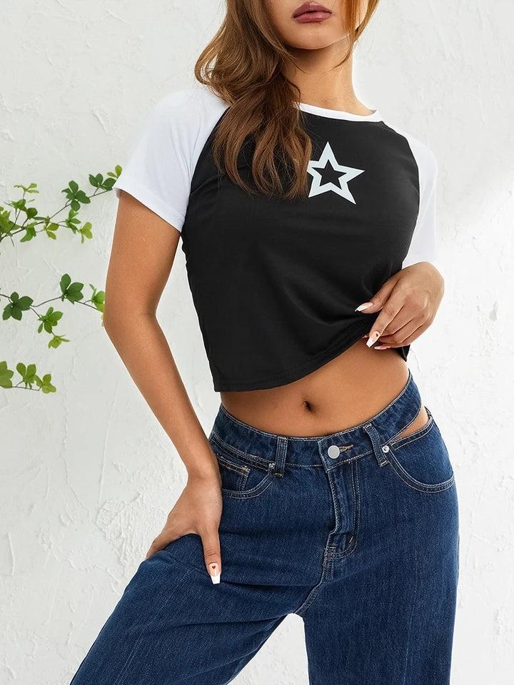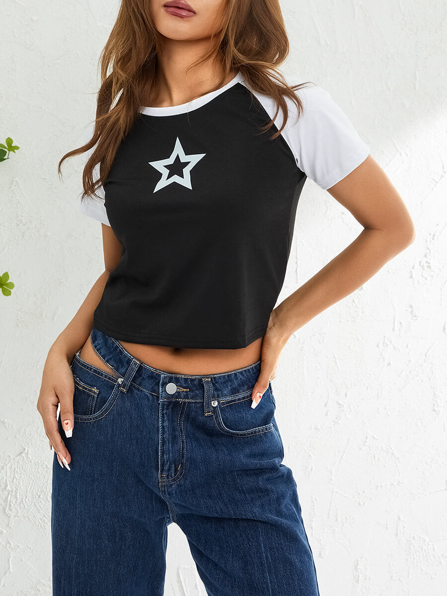 It features a bold star print design on the chest. It has a classic crew neckline and short sleeves.