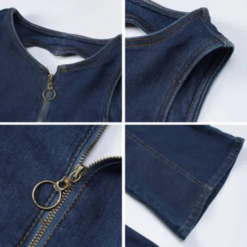 The eye-catching denim jumpsuit boasts a retro-inspired design. accentuating your curves with snug seams for a corset-like effect.