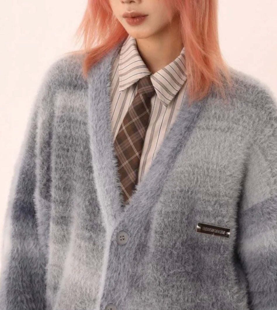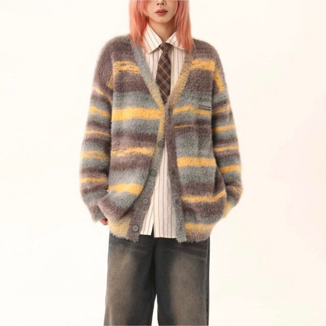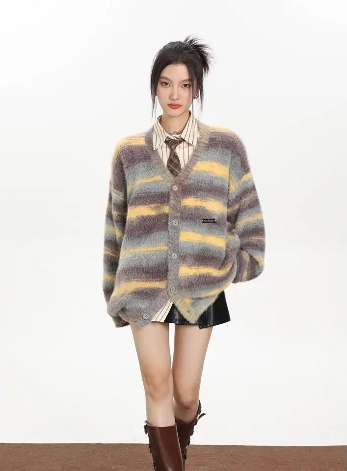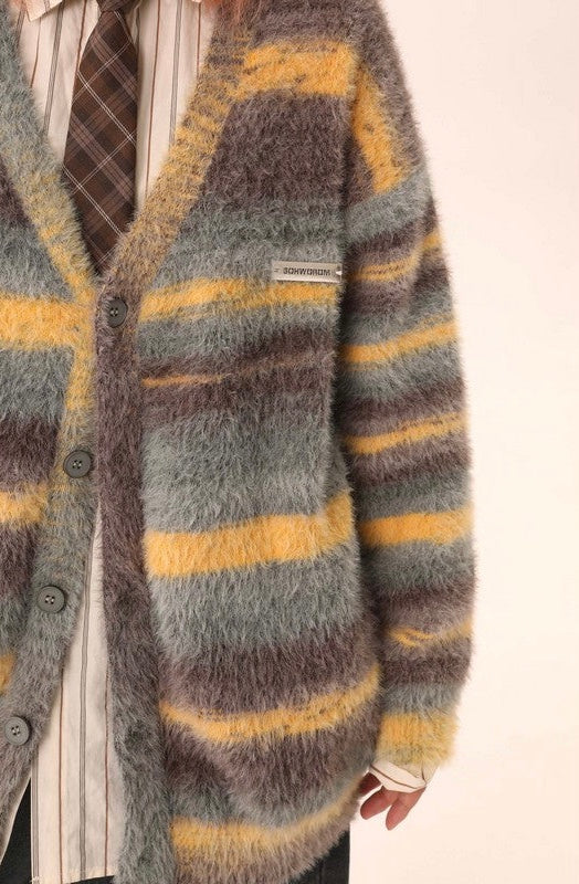 This cozy sweater features a button-up design. v-neckline and horizontal stripes in varying widths.