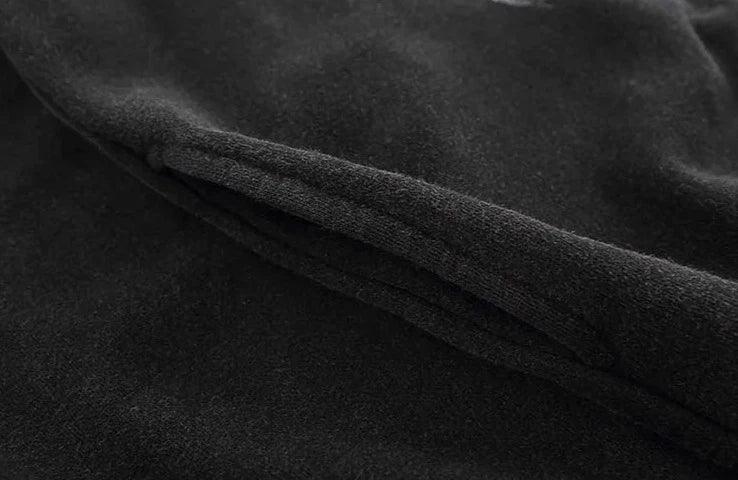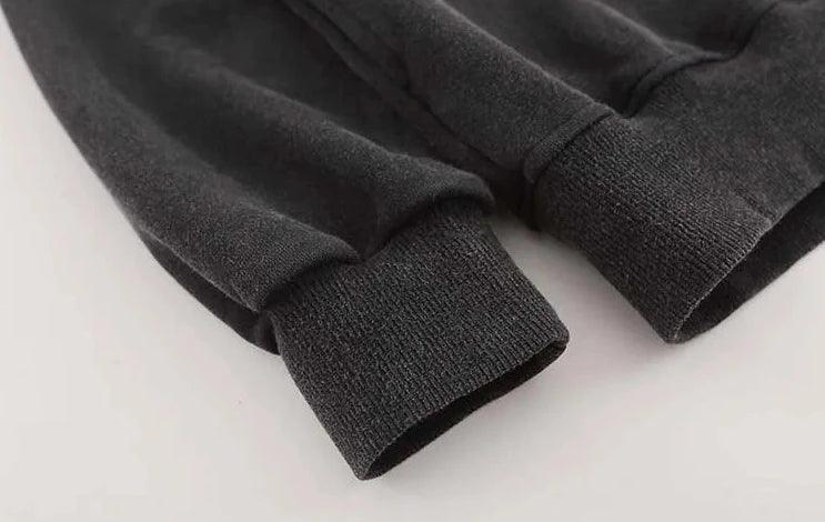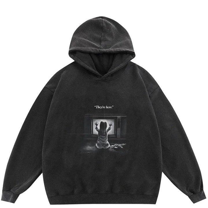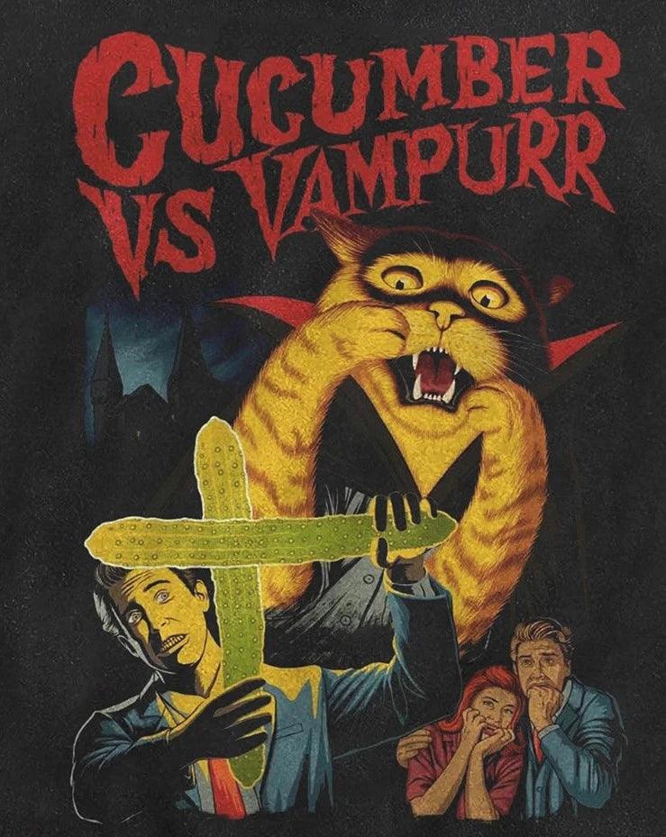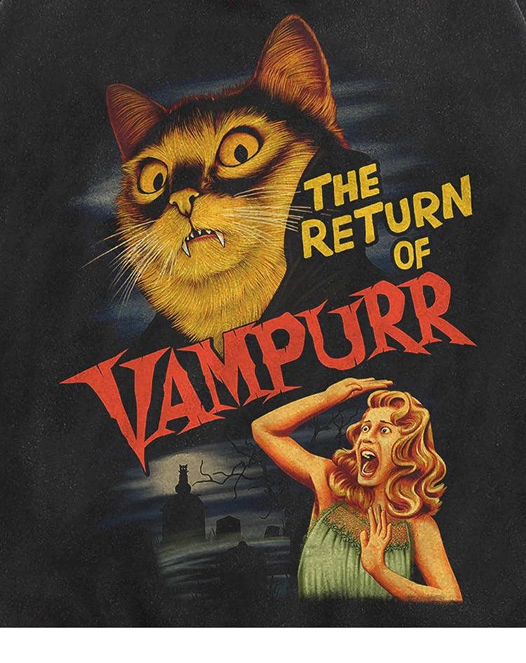 Vonvex's Vampurr Cat Graphic Oversize Hoodie: Vintage gothic style in cotton-poly blend. Standard thickness. loose fit. hooded collar. washed black hue.