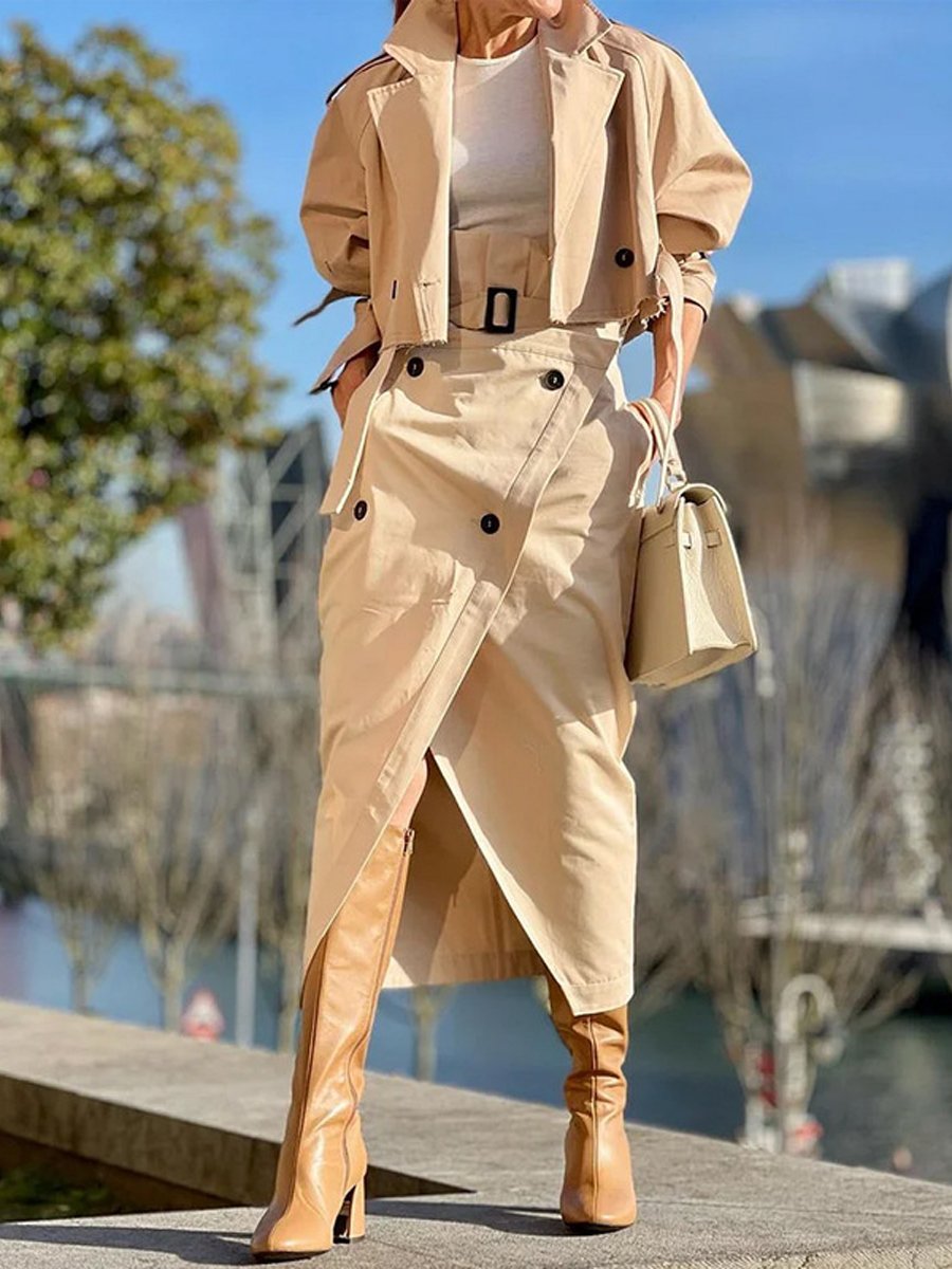 This stylish two-piece set offers simplicity without sacrificing style. The unique design of the short-sleeved outer jacket. complete with a fashionable belt. not only enhances its overall chic appeal but also effortlessly accentuates an elegant waistline.