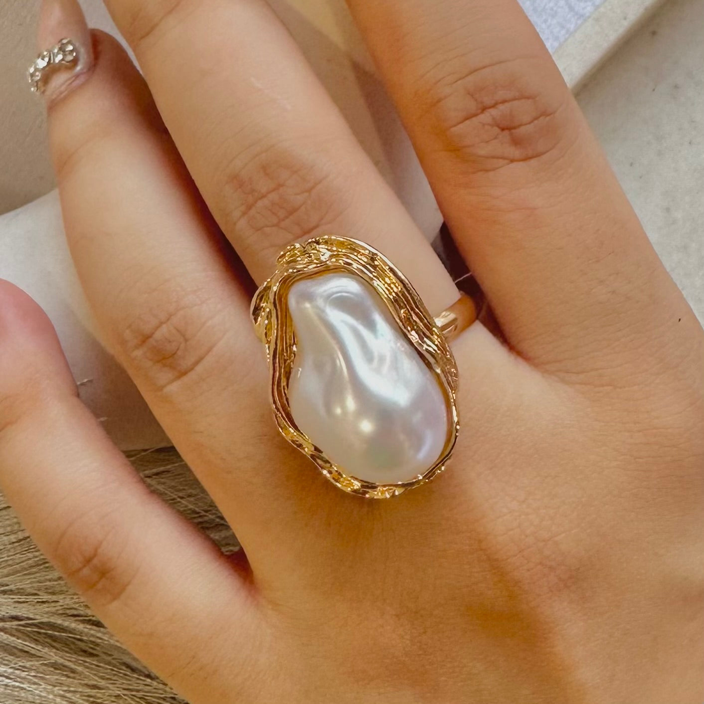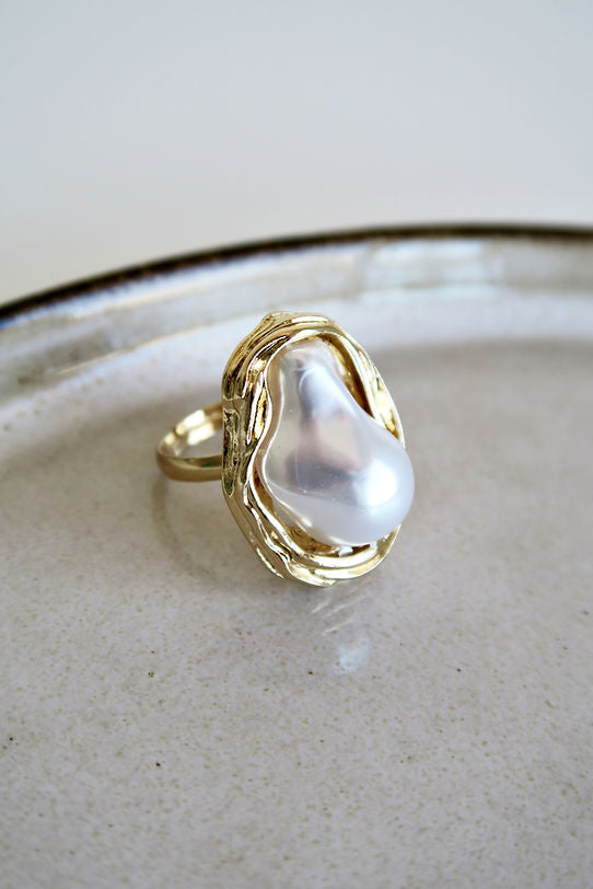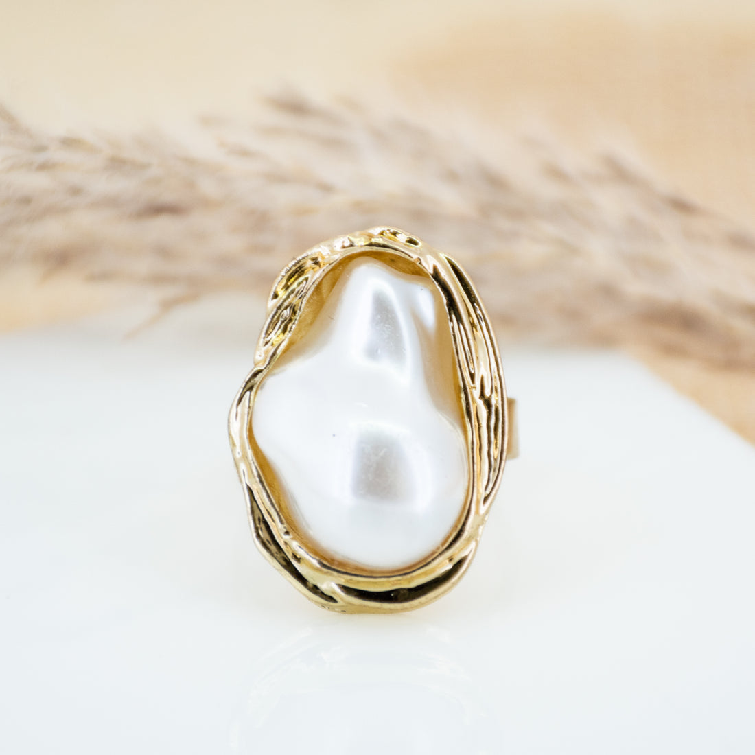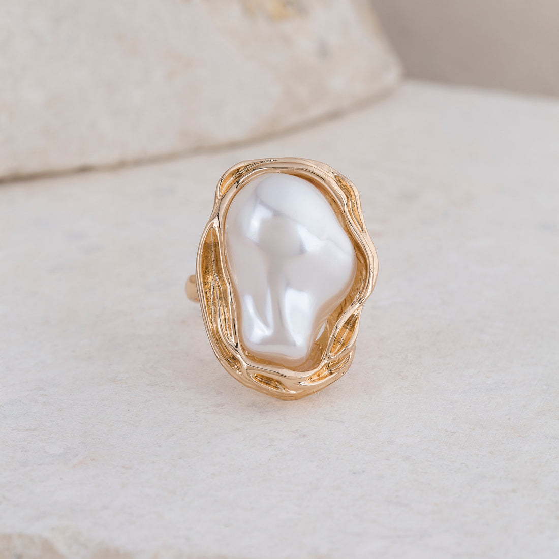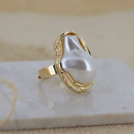 The exclusively irregular pearl-shaped ring is a golden-hue ring embellished with faux pearl.