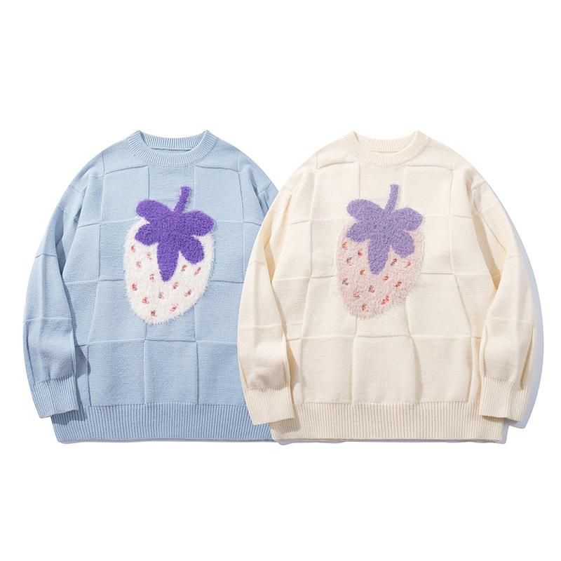 The Kawaii Strawberry Plaid Knit Sweater brings playful charm with its cute strawberry accents and cozy plaid pattern. perfect for a sweet. casual aesthetic.