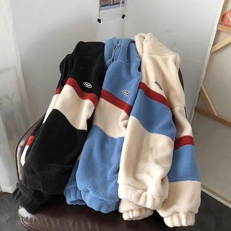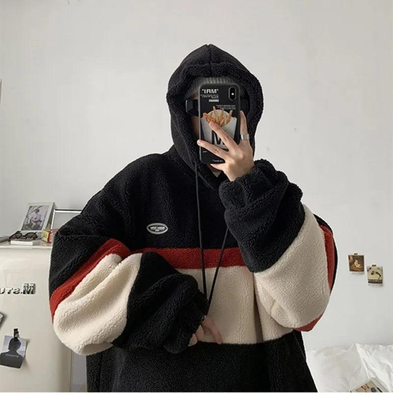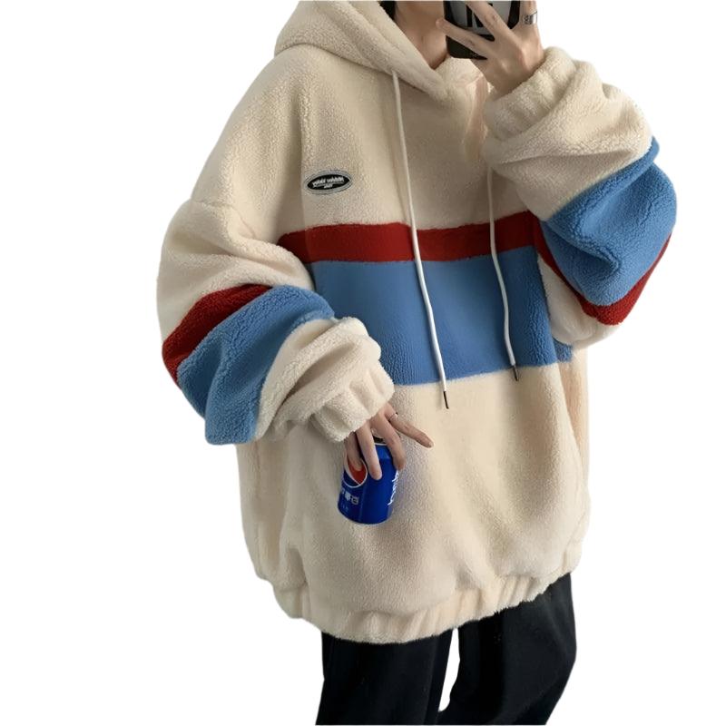 This Korean Style Fleece Hoodie is crafted from polyester. featuring a patchwork pattern with a loose cut and regular clothing length. Its hooded collar provides added comfort.