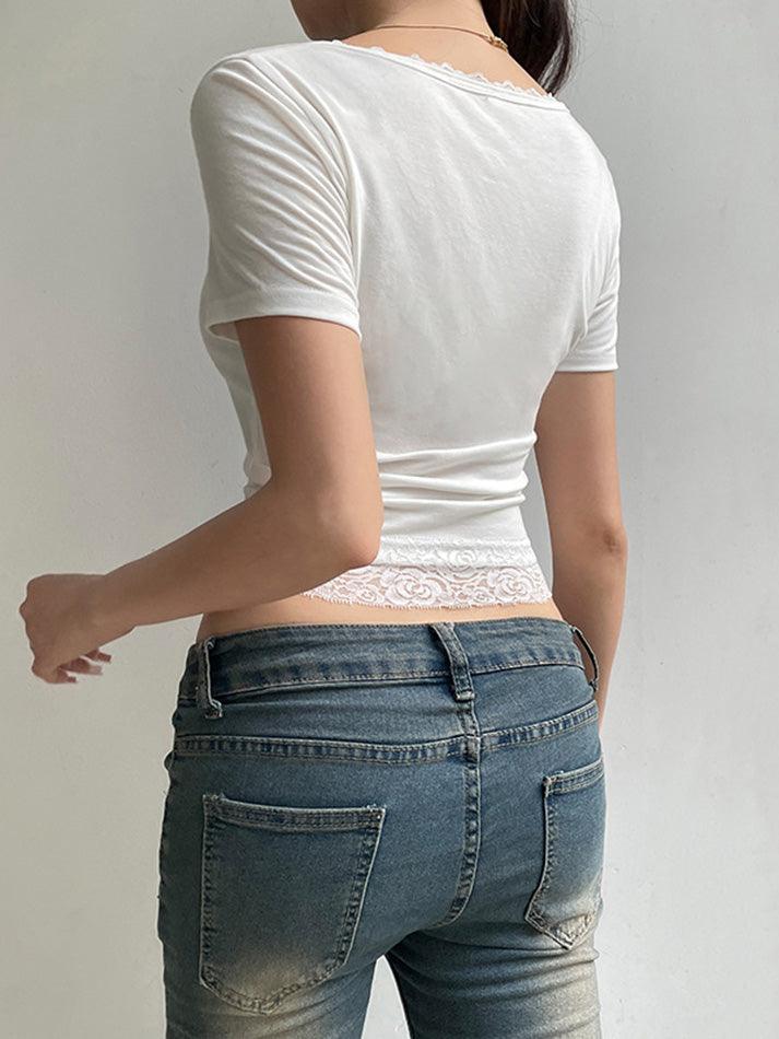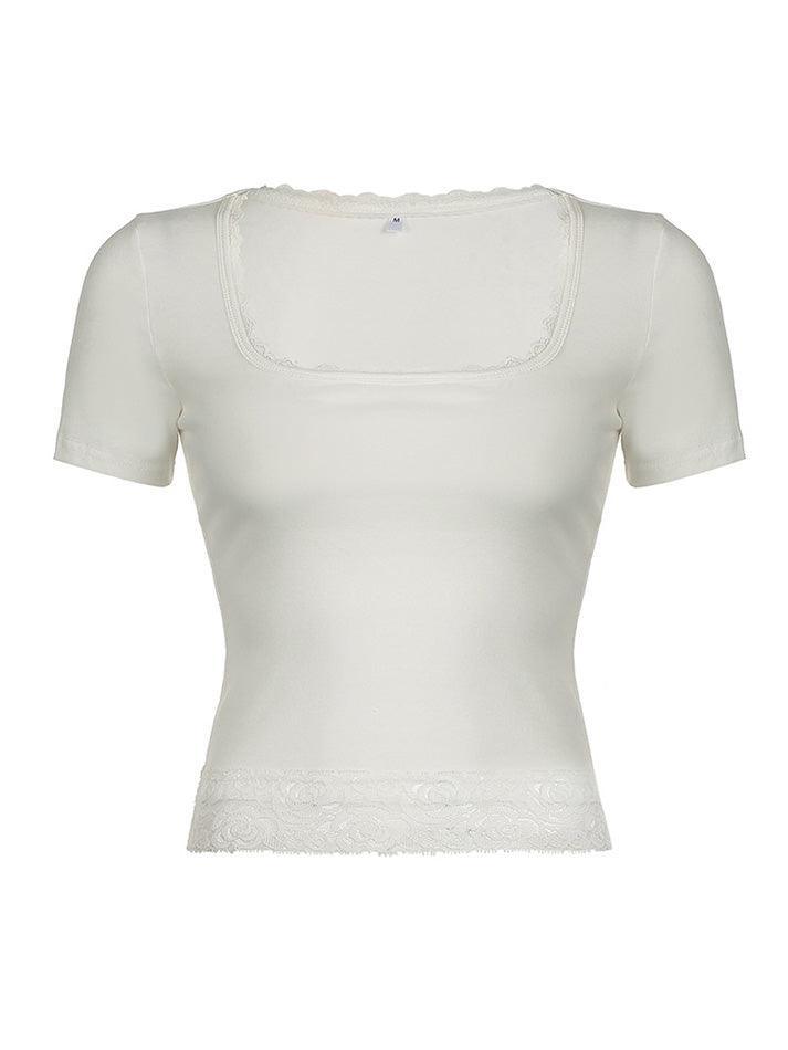 Increase quantity for Lace Trim Splice Square Neck Crop Short Sleeve Tee