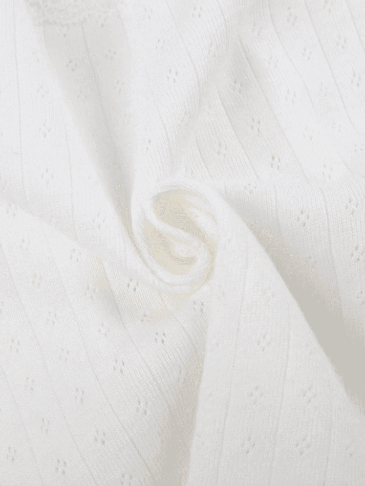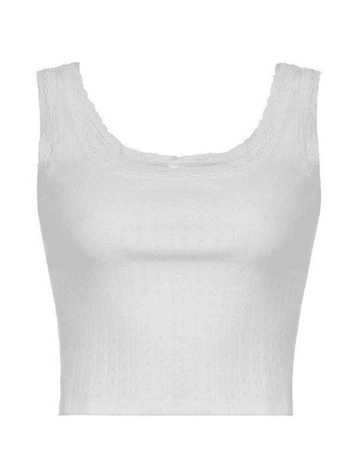 Description: This basic but cute crop top is crafted from pointelle-knit fabric. trimmed with lace design through the collar. features a skin-tight silhouette. and has slightly open back design.