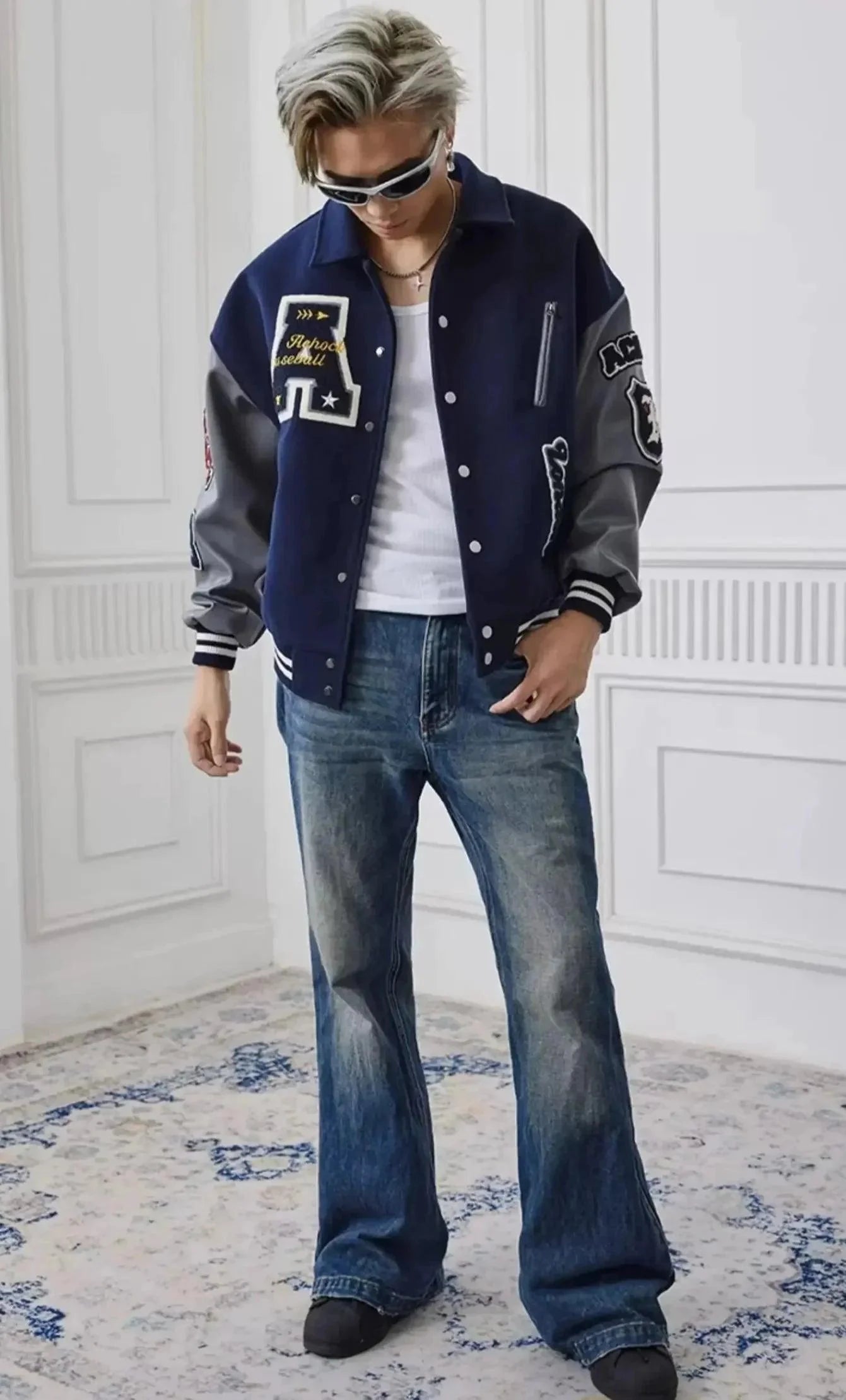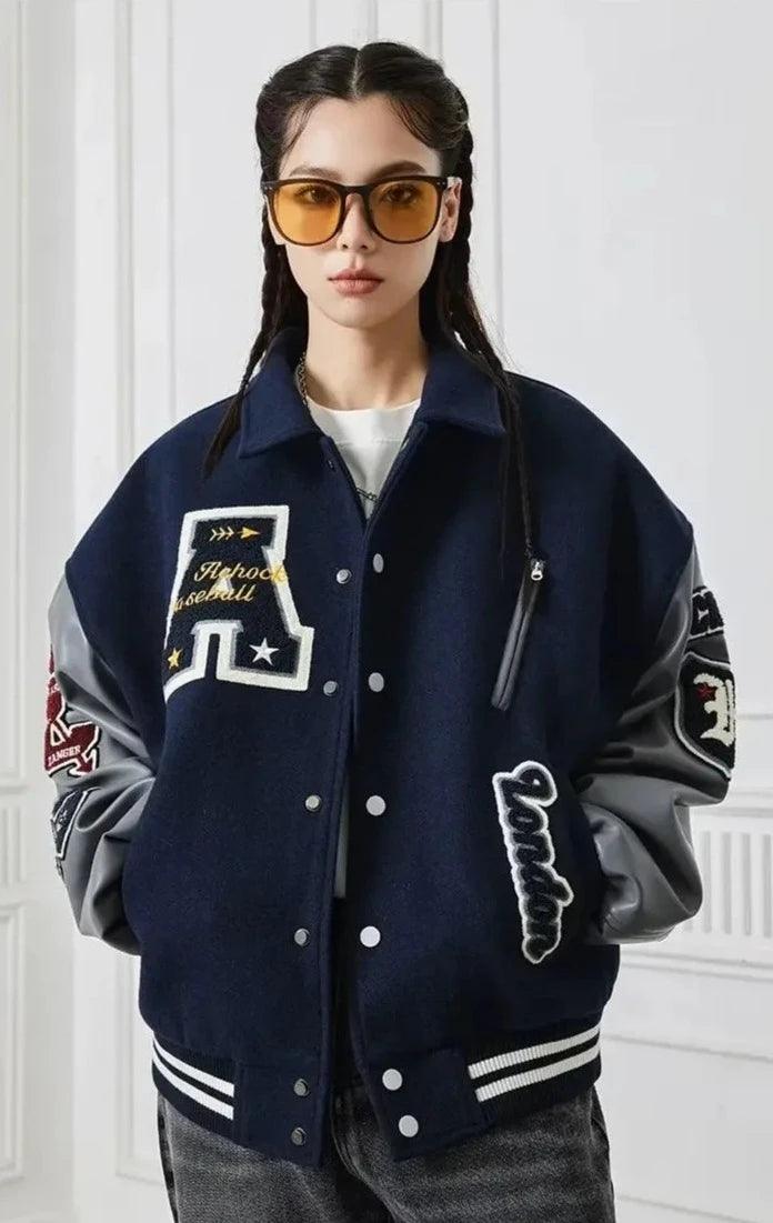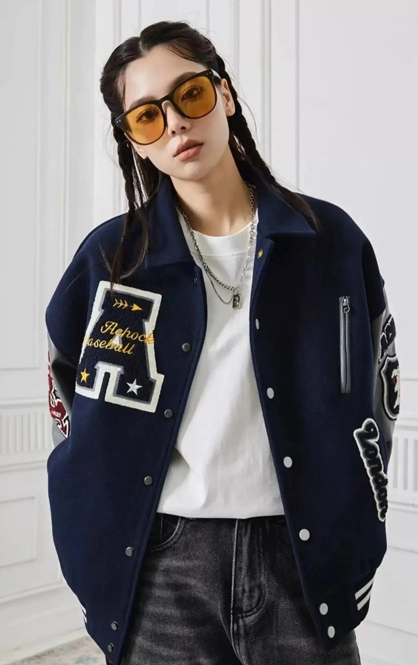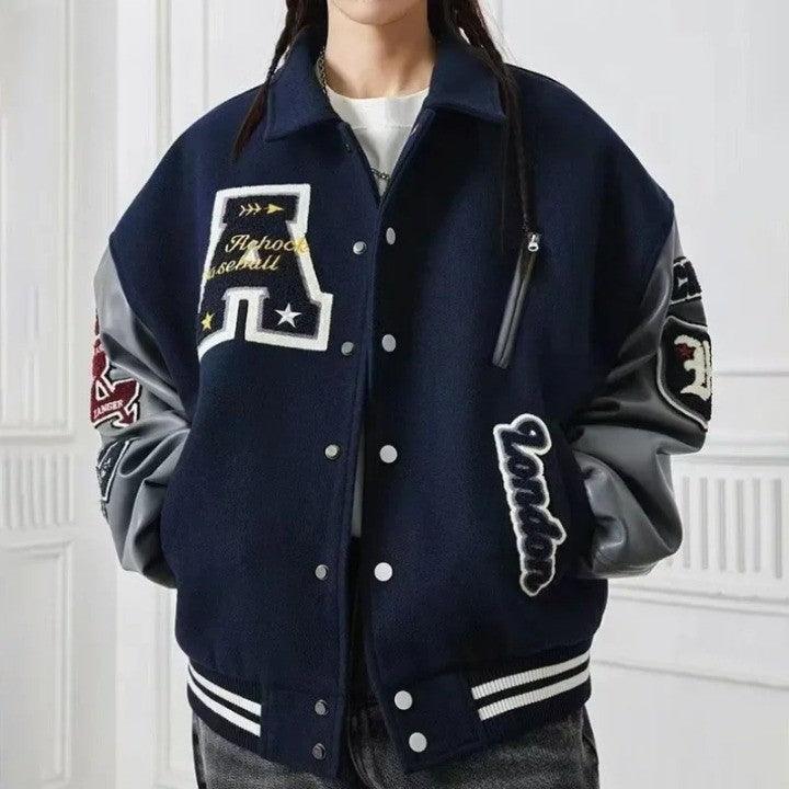Upgrade your street style with our Letter Embroidery Varsity Jacket. Cotton-polyester blend. standard thickness. embroidered details. single-breasted closure.