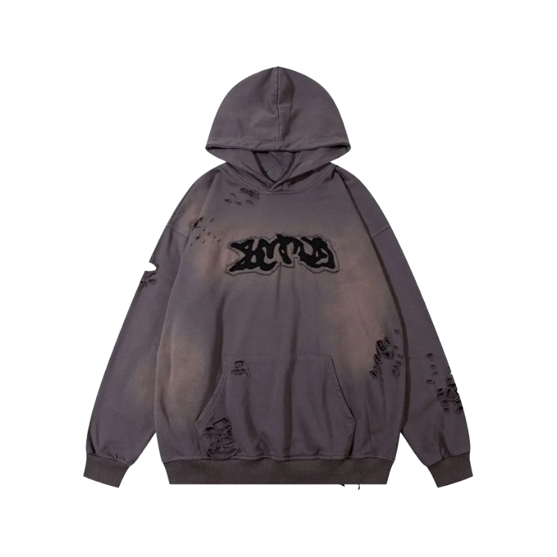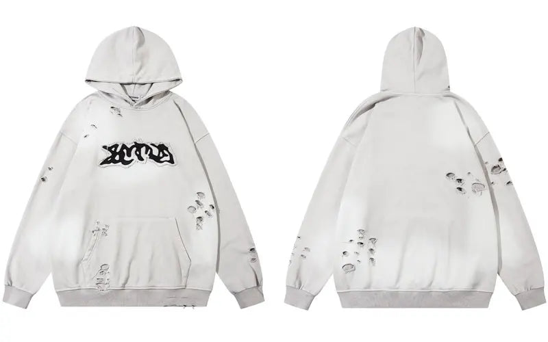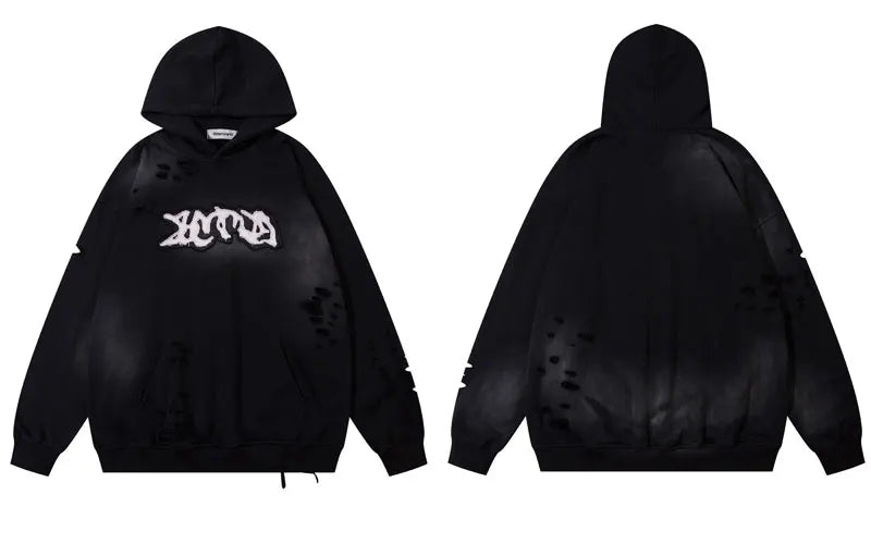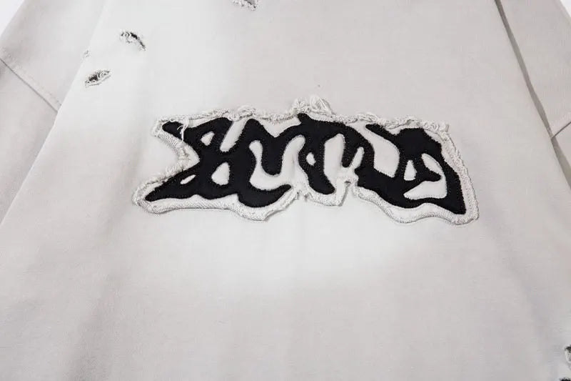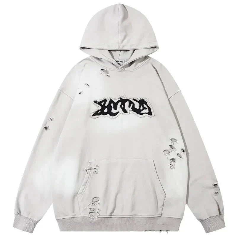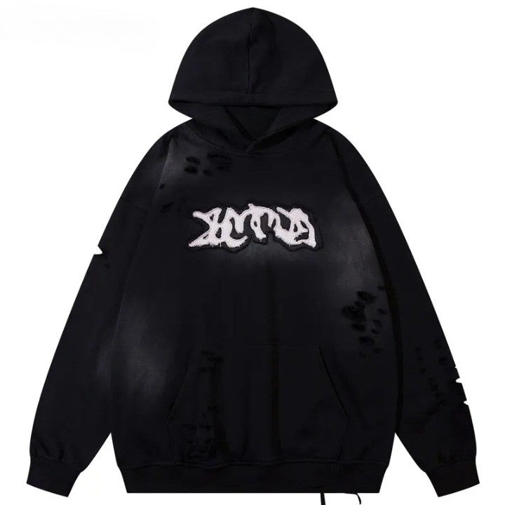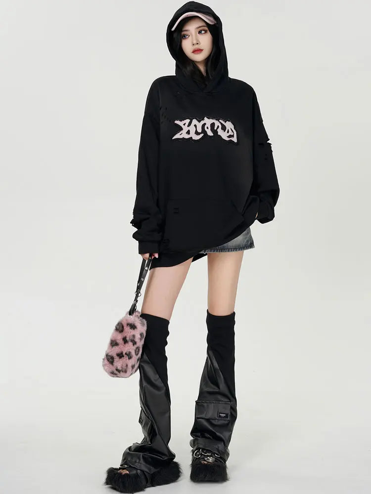 Elevate your streetwear with our Letter Patch Ripped Hoodie. Standard thickness. hooded. and crafted from a cotton-poly blend.