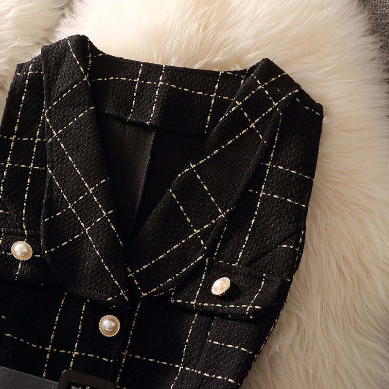 The London Chic 2 Piece Set boasts a vintage-style plaid tweed vest coat. completed with a matching black belt. pockets. and delicately arranged ornate gold button details. The turn-down collar exudes elegance. while the accompanying black turtleneck sweater with long sleeves provides a subtle yet stylish contrast. It is perfectly tailored for women who demand only the finest in fashion.