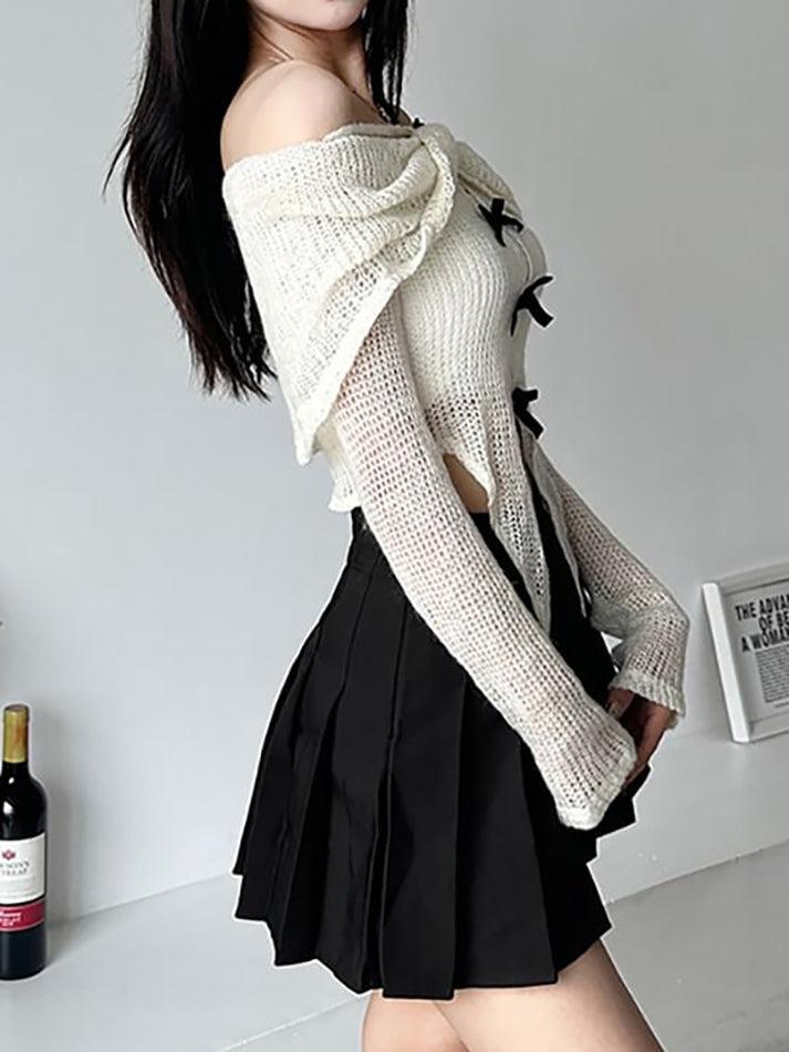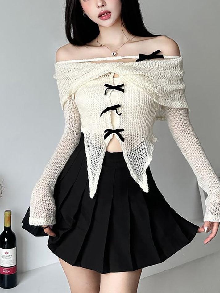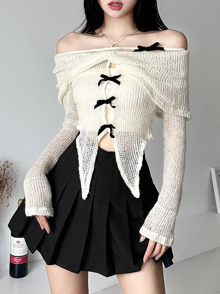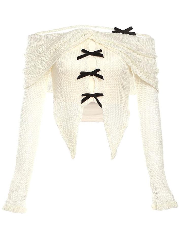 Long-Sleeve Off-Shoulder Plain Asymmetrical Bow Crop Knit Top - HouseofHalley
