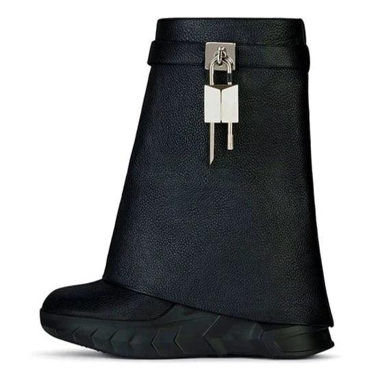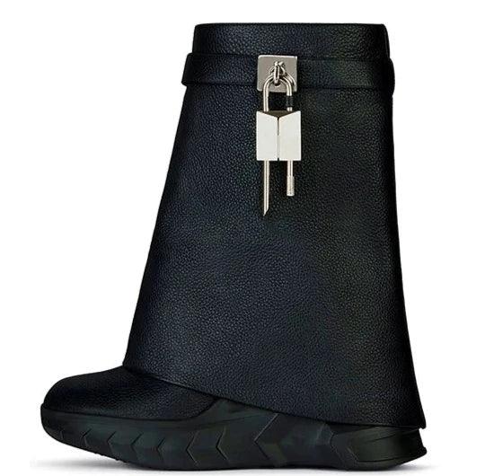 "Step into luxury with Women's Mid-Calf Boots. Perfect for Kentucky Derby 2024. Cavs vibes. and Kendrick Lamar beats. Crafted with genuine cow leather shaft and upper for durability. PU insole and wedge heels for comfort. Metal decoration adds flair. Round toe and solid pattern for timeless style. Zip closure for ease. Elevate your fashion with British style."