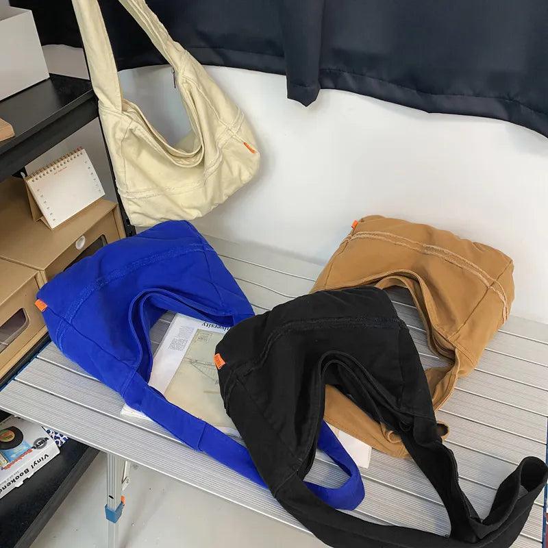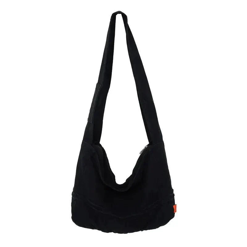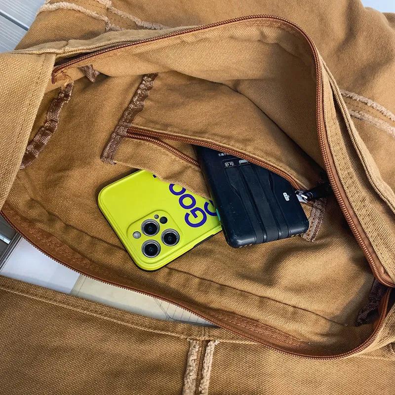 This unisex bag is crafted from a durable canvas material with a solid pattern. It's designed to be worn as both a shoulder bag and a crossbody bag. The main compartment can store necessary items and features an interior cell phone pocket for convenience. It also has an interior compartment that closes securely with a zipper.