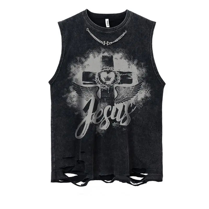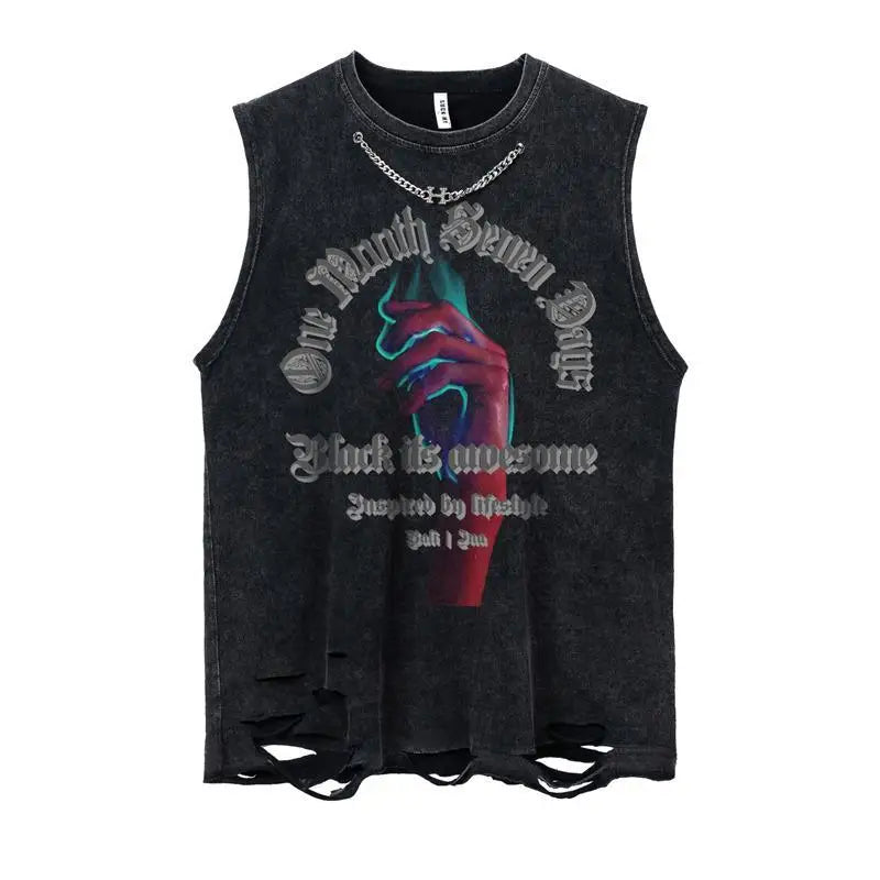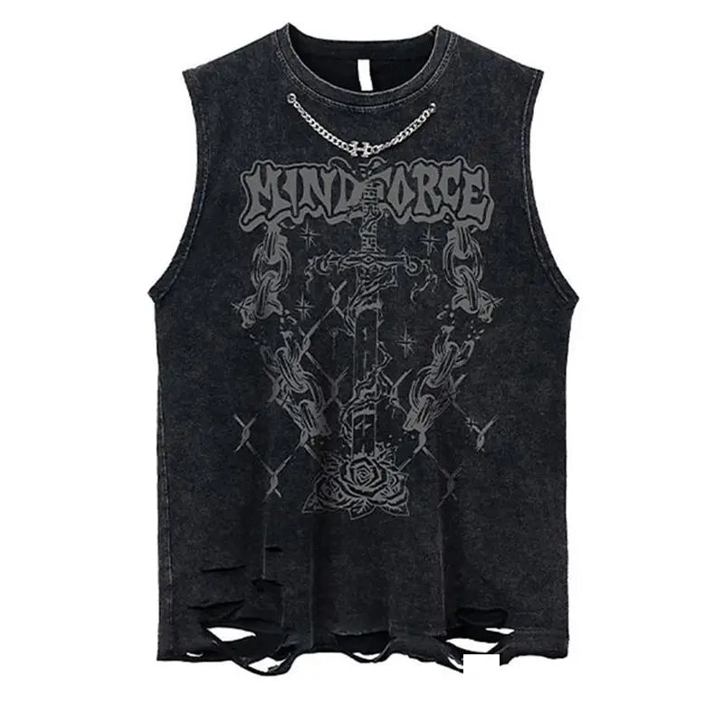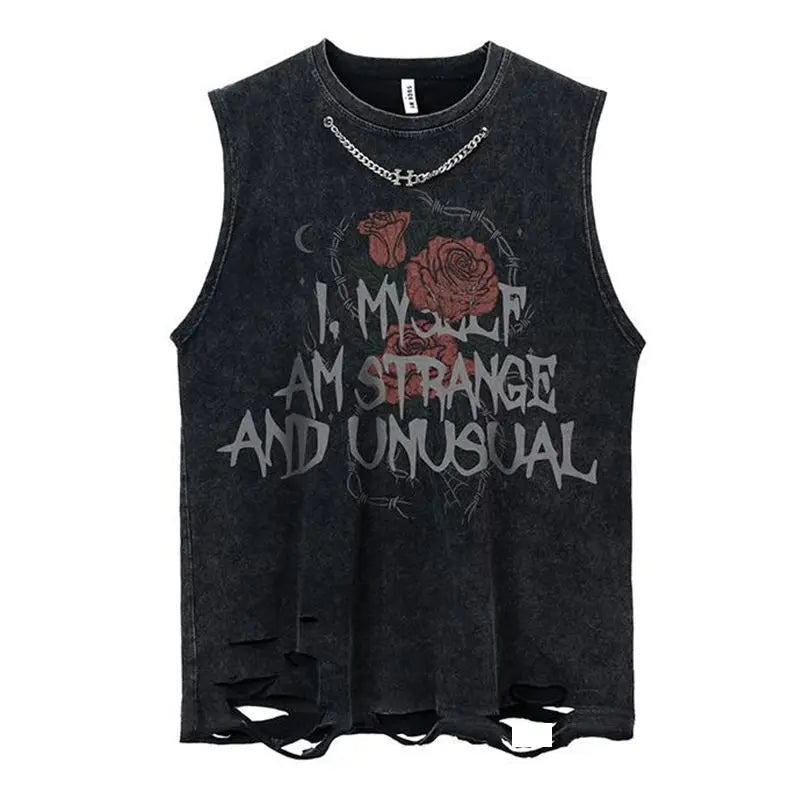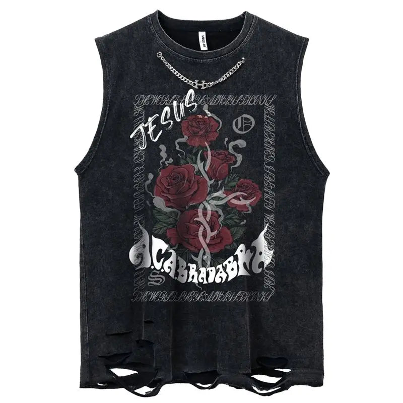 The Metal Embellished Rose Washed Distressed Tank Top combines rugged style with a touch of elegance. Featuring distressed detailing. metal accents. and a faded rose graphic. this tank offers a bold yet chic look. perfect for adding an edgy twist to your streetwear.