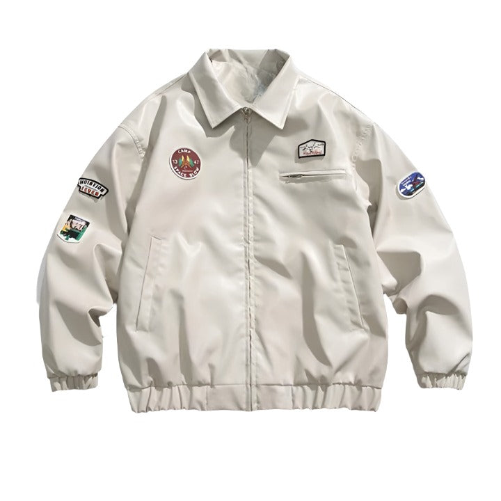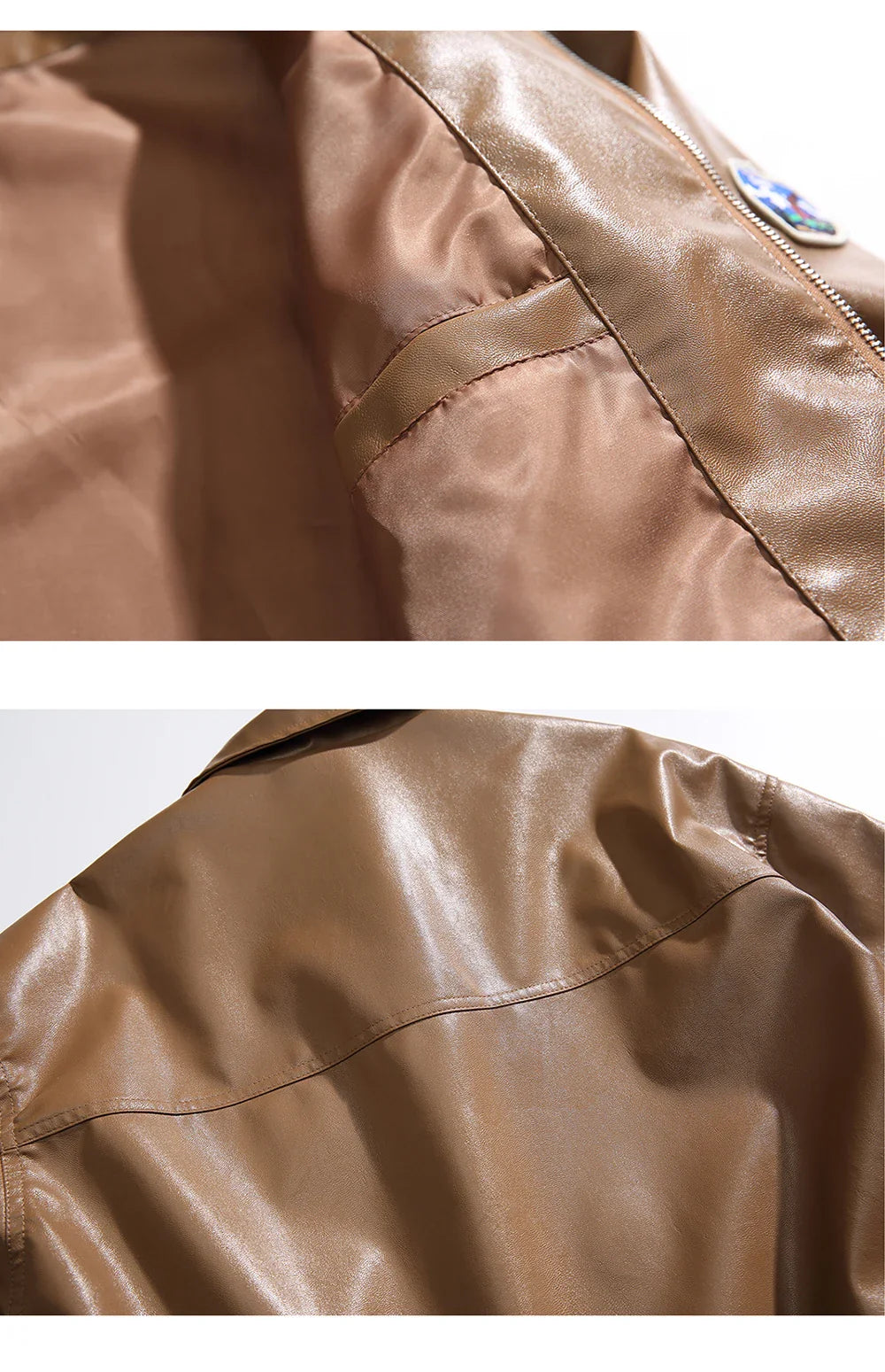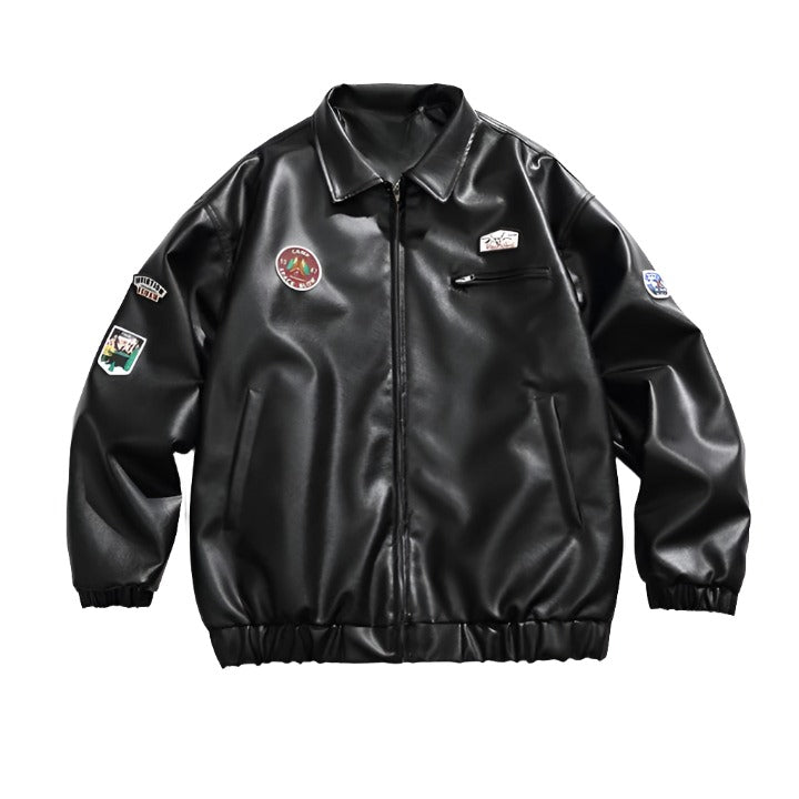 Vonvex Streetwear's Motorcycle Varsity Leather Jacket combines viscose and polyester with vintage decorations. Features include a turn-down collar. zipper closure. and solid pattern for a classic. edgy look.