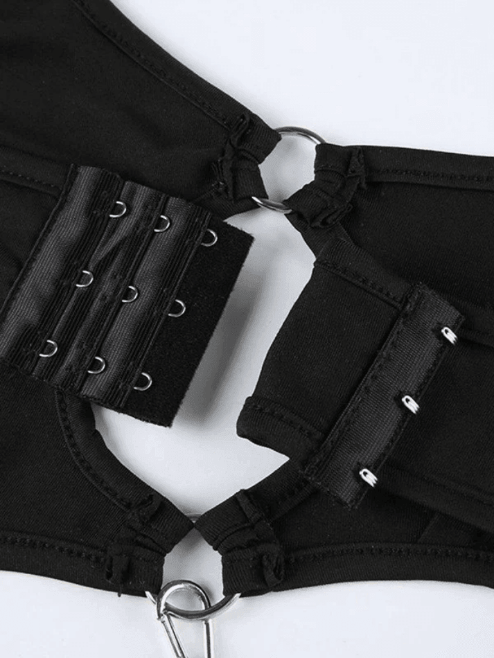 Description: Elevate your wardrobe with this stunning cutout black cami bodysuit. Embrace the fusion of street. Y2K. sexy. punk. grunge. and hip pop styles in one standout piece. Crafted from a comfortable blend of polyester and spandex. it offers a slim fit and a flattering V neckline. The sleeveless design and multiple cutout holes with o-ring accents add an edgy touch. Unleash your fashion-forward spirit with this irresistible bodysuit.