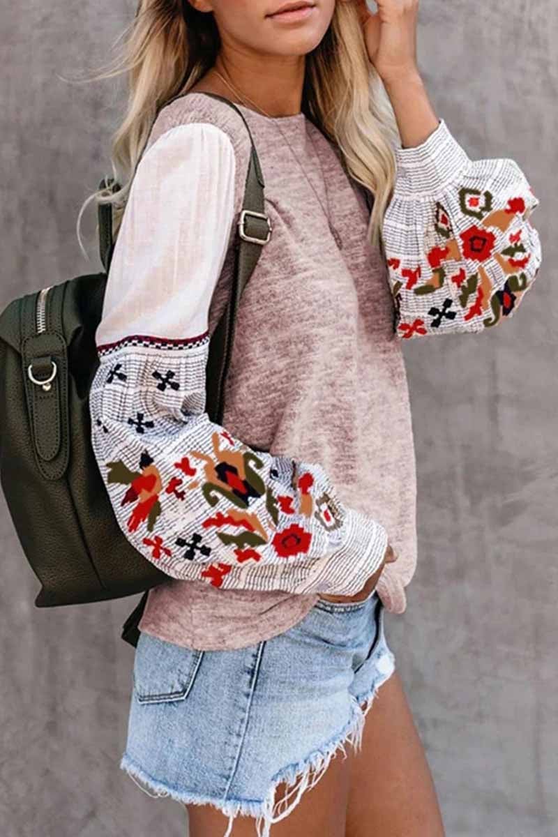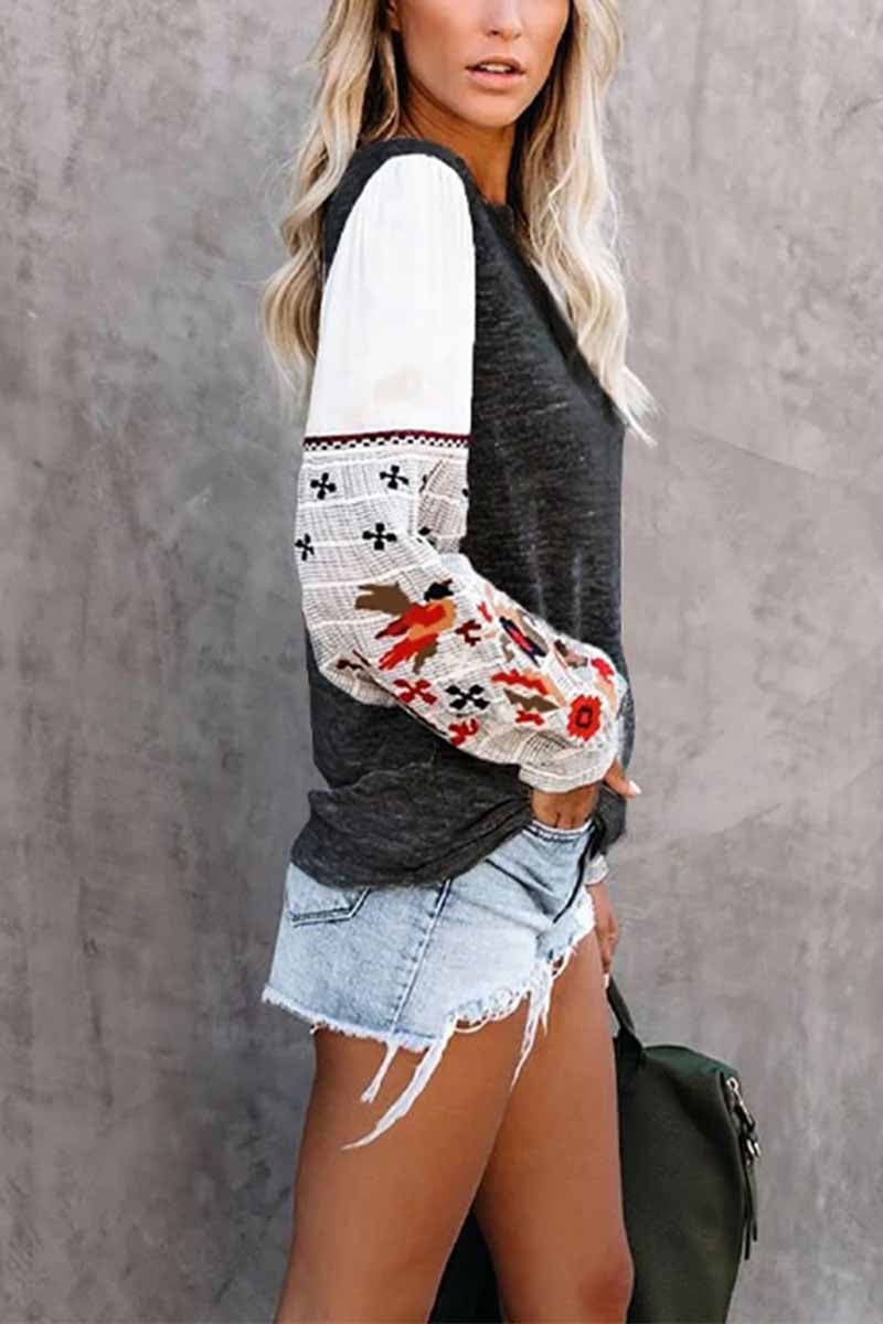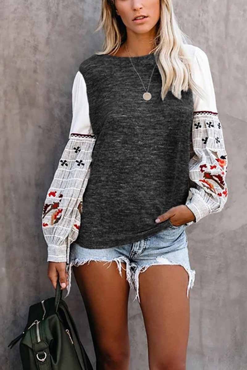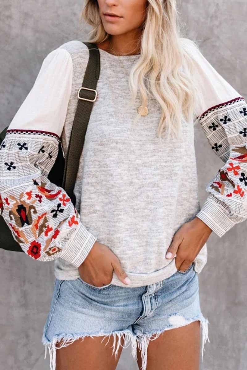 It features white billowy sleeves with buttoned cuffs and an abstract embroidered design in navy. coral. red. burgundy. ivory. sage and peach topping grey and white stripes. Designed with a wide crew neckline on a heather grey soft fabrication. Effortlessly pair it with classic skinnies and booties for a pre-fall statement.