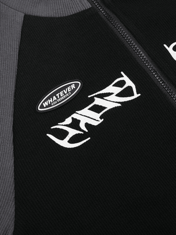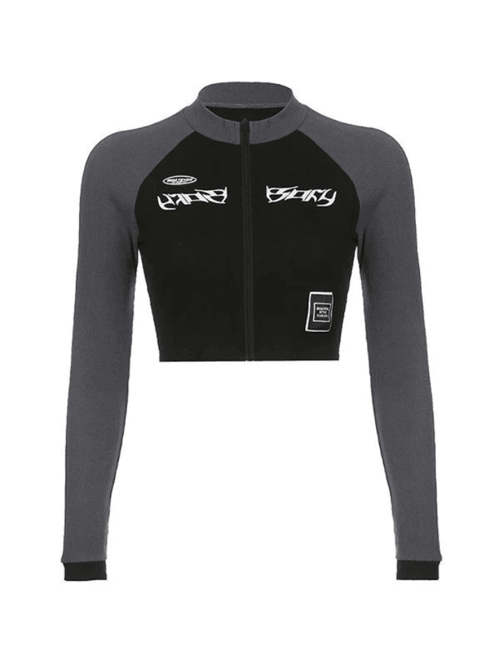 Description: This motorcycle-inspired crop top featured a contrast panel style. with logo detail at front. and has a metal zip fly design.