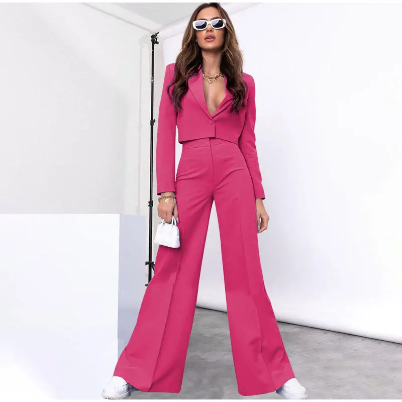 A chic and sophisticated ensemble designed to make a statement. This suit features a cropped blazer paired with coordinating pants. offering a modern twist on classic tailoring for a contemporary look.