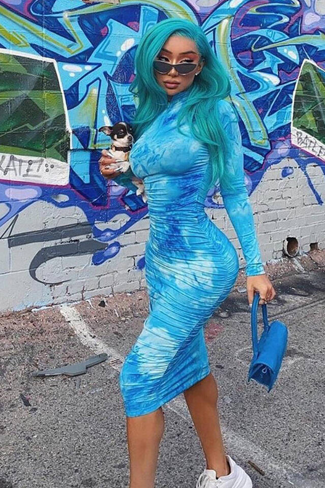 Caress those curves in this stunning long-sleeved tie-dye bodycon. This statement sheath dress features a mid-length hem. flattering turtleneck and plenty of pretty patterning.