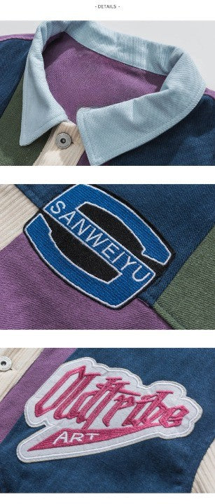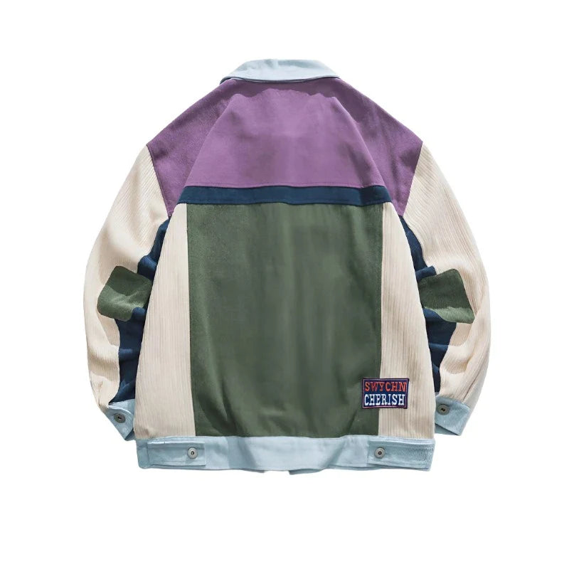 The Vonvex Retro Patchwork Bomber Jacket. made from cotton and polyester. features colorful patchwork. embroidery. a turn-down collar. and single-breasted closure. Its loose fit and conventional cuffs make it a stylish. standout piece for any wardrobe.