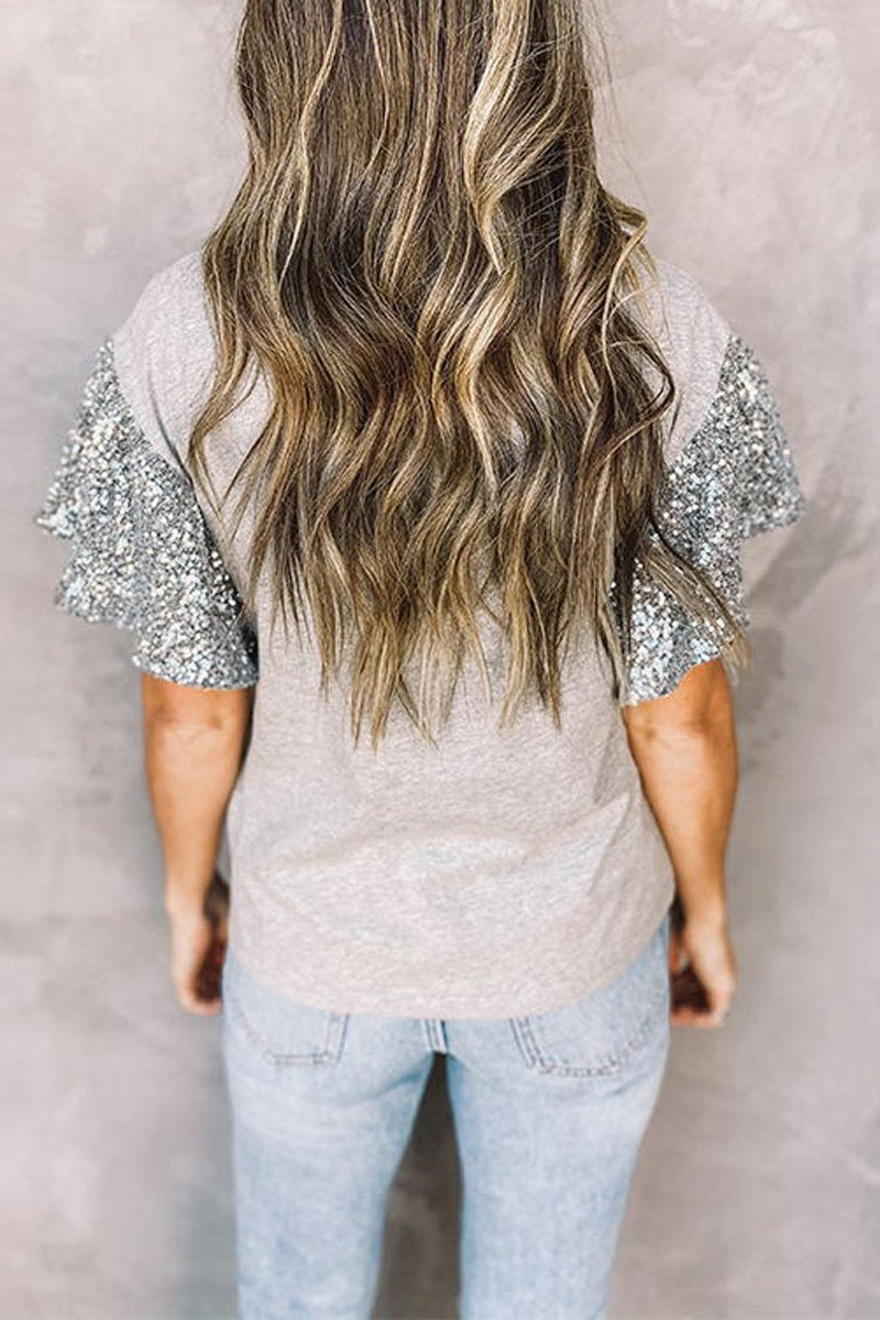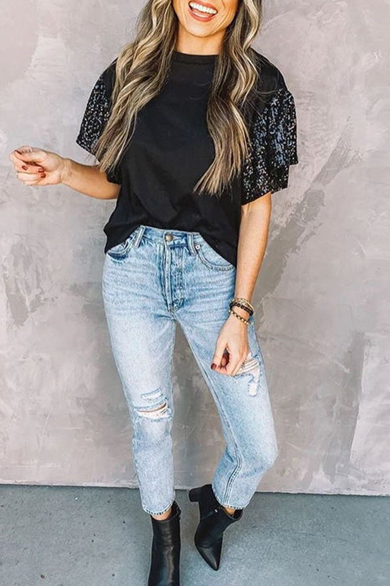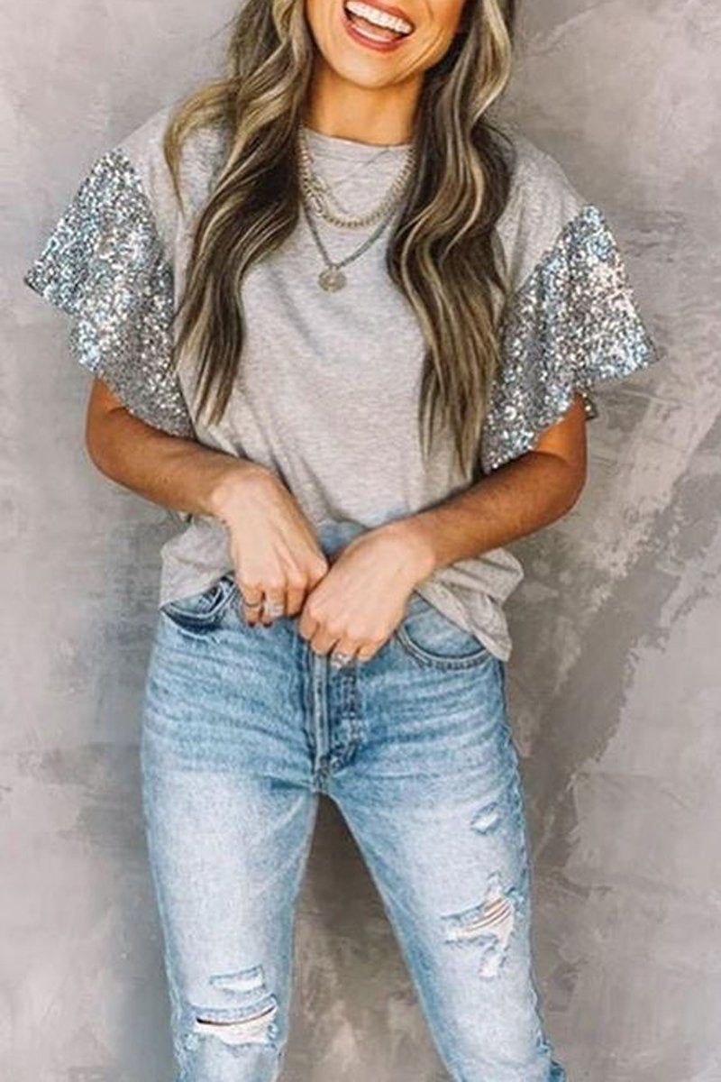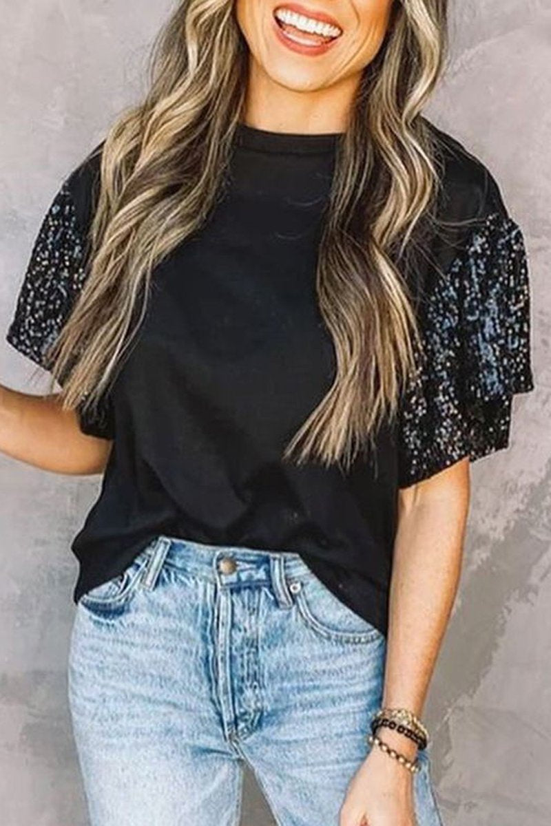 Sequin Stitching Sleeve Short Sleeve T-Shirt