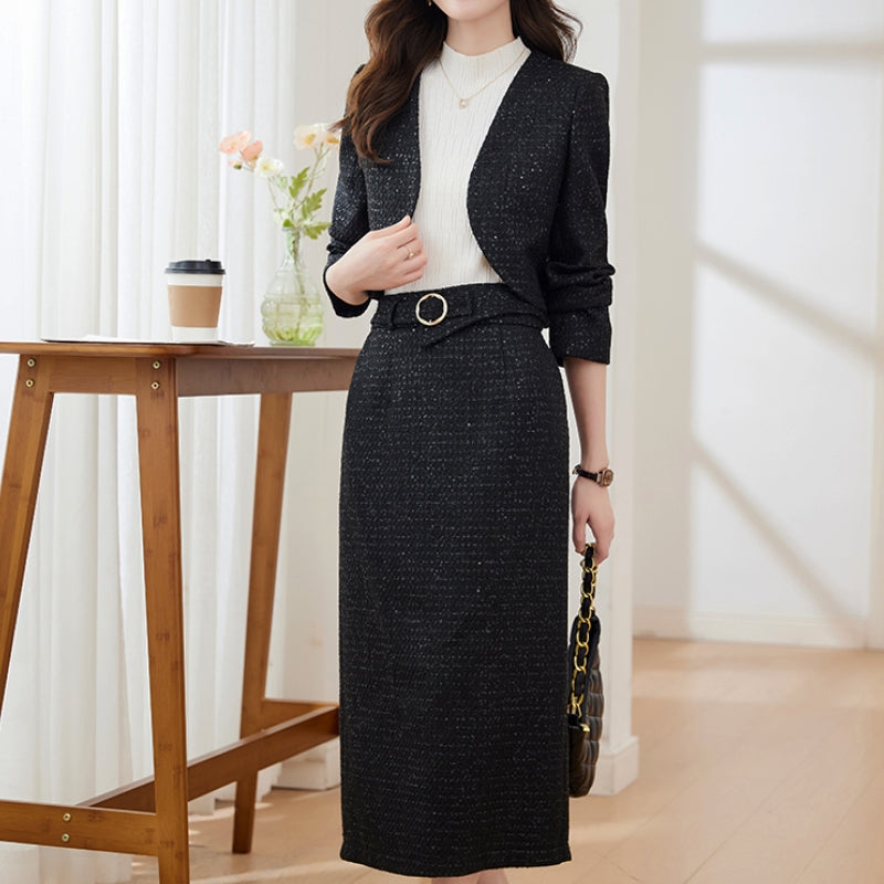 This exquisite set is designed to make you stand out at any formal event with its impeccable style and shimmering allure. Skirt is falling gracefully to a midi length. and it strikes the perfect balance between sophistication and contemporary style. Complementing the midi skirt is a tailored blazer that takes this set to the next level.