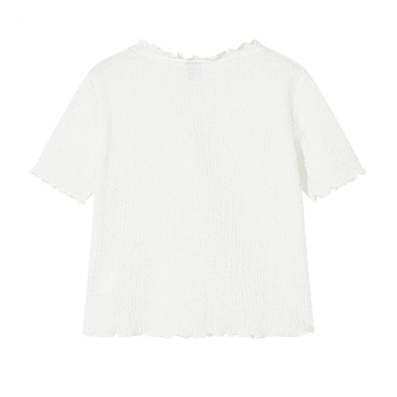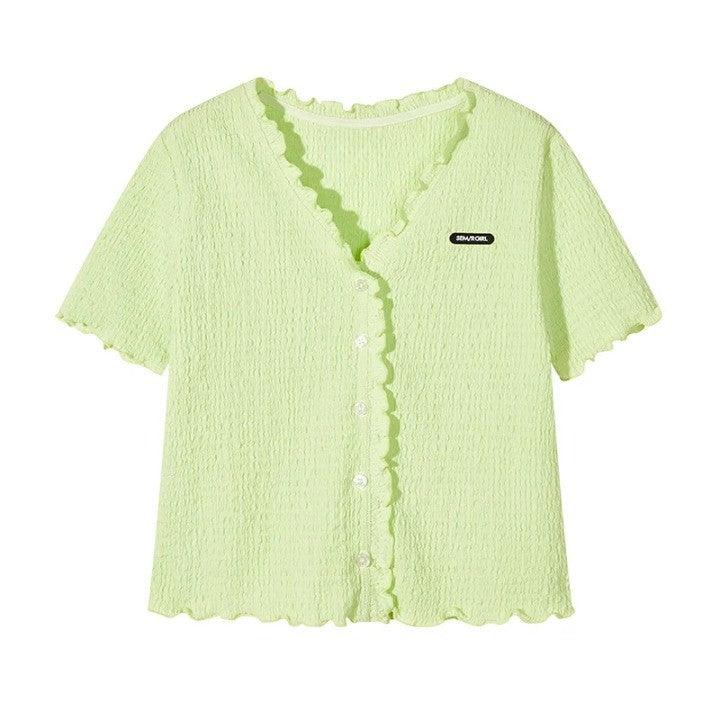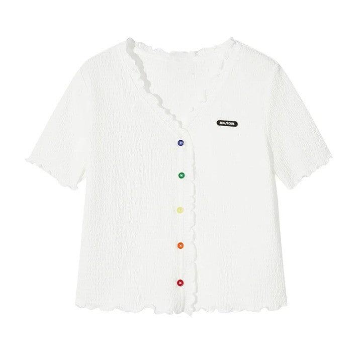 The Short-Sleeved Knitted Cardigan from VONVEX. made of polyester and spandex. features a V-neck. button decoration. and slight stretch. This solid-pattern. straight-fit cardigan offers comfort and style.