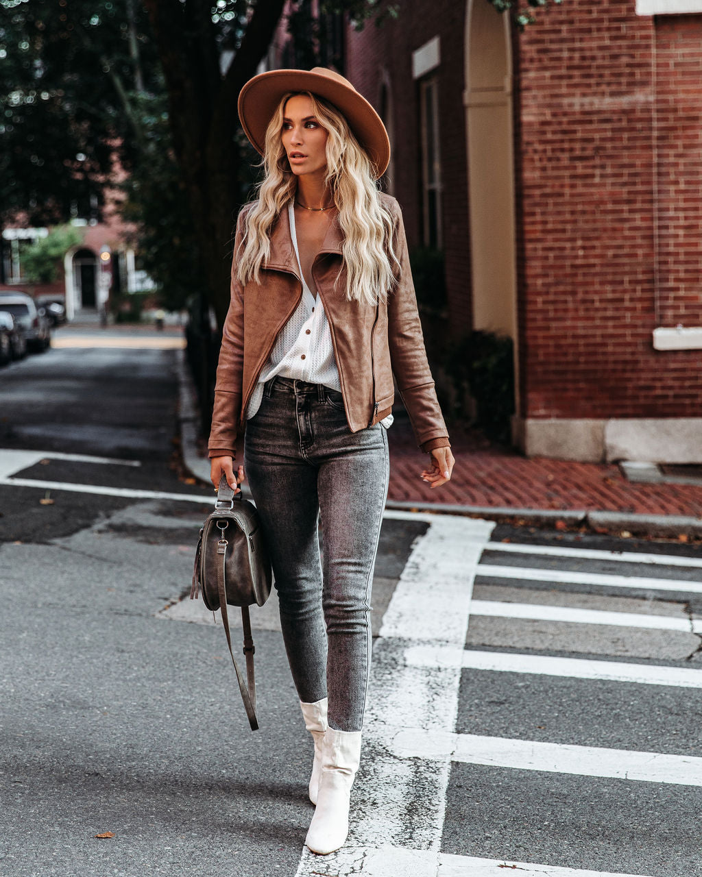 //Best Seller// New Color// You'll definitely be a slick chick in this stunning outerwear piece that's our favorite of the collection! We love our taupe Slick Chick Coated Faux Leather Moto Jacket that has a thick luxe feel and moto style. The layered look is defined by the ribbed knit hemline and sleeve hems - giving you extra warmth. The trendy piece zips closed and is finished with side pockets!
