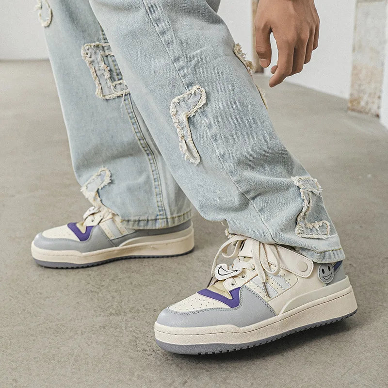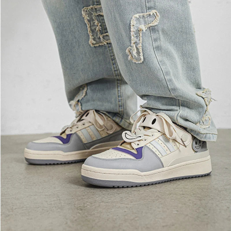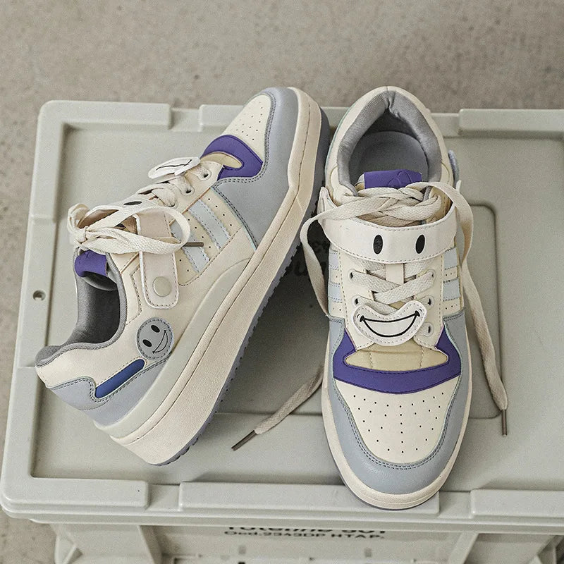 Meet the Smiley Strap Kicks Sneakers. designed with a playful mixed color pattern. These lace-up skateboard shoes offer a secure fit and feature a polyester lining. combining comfort and style for your next skate session.
