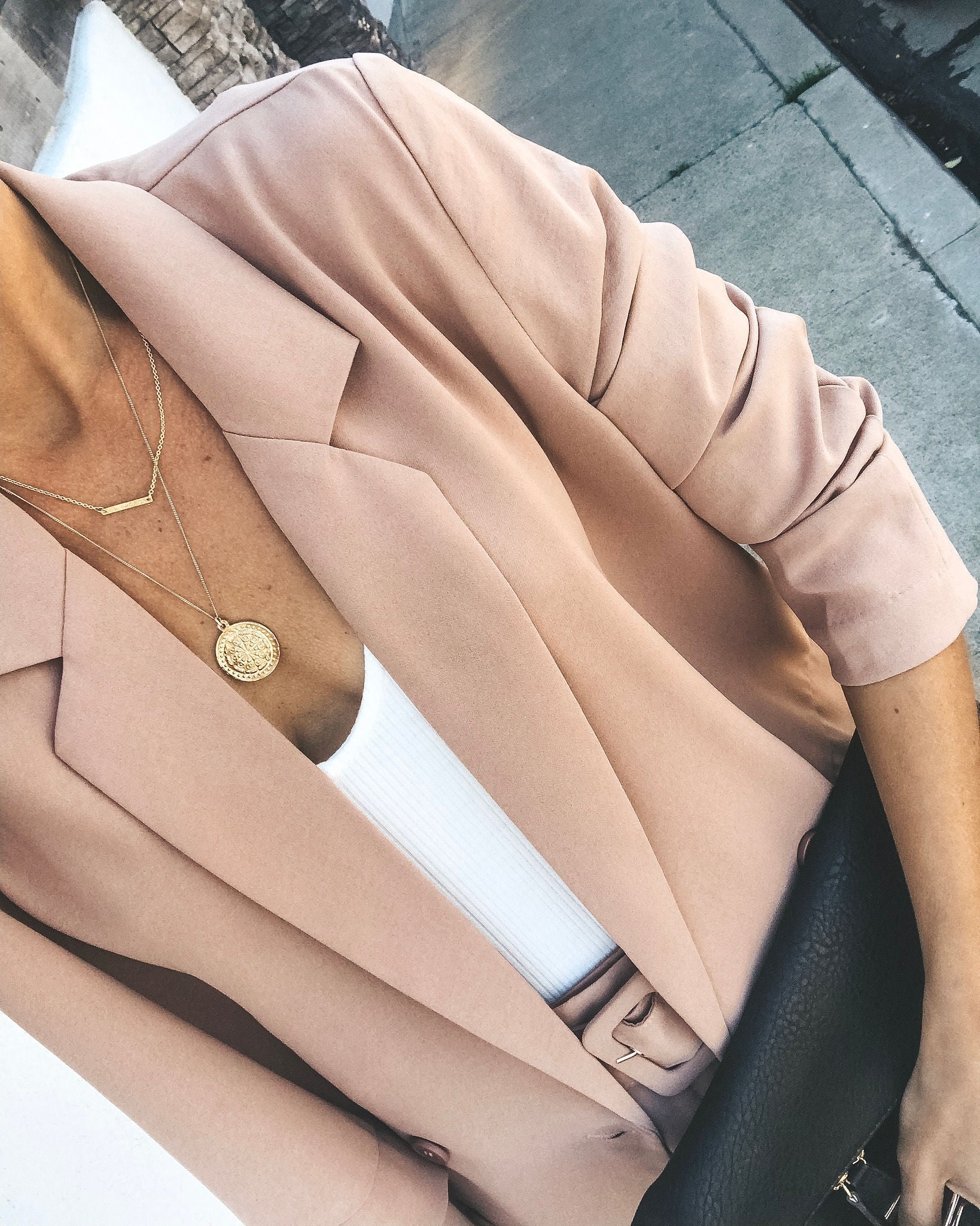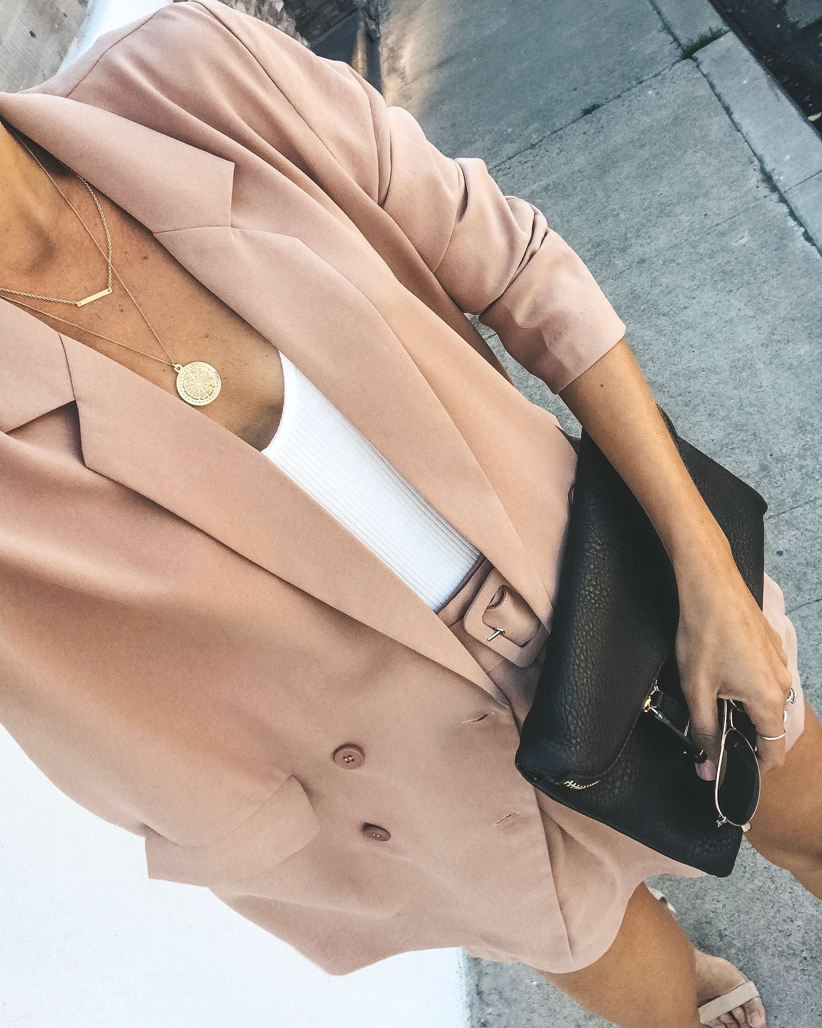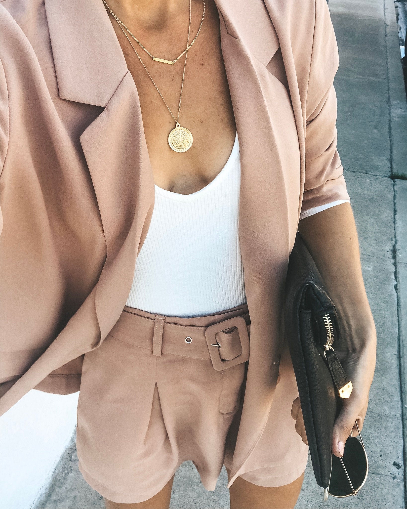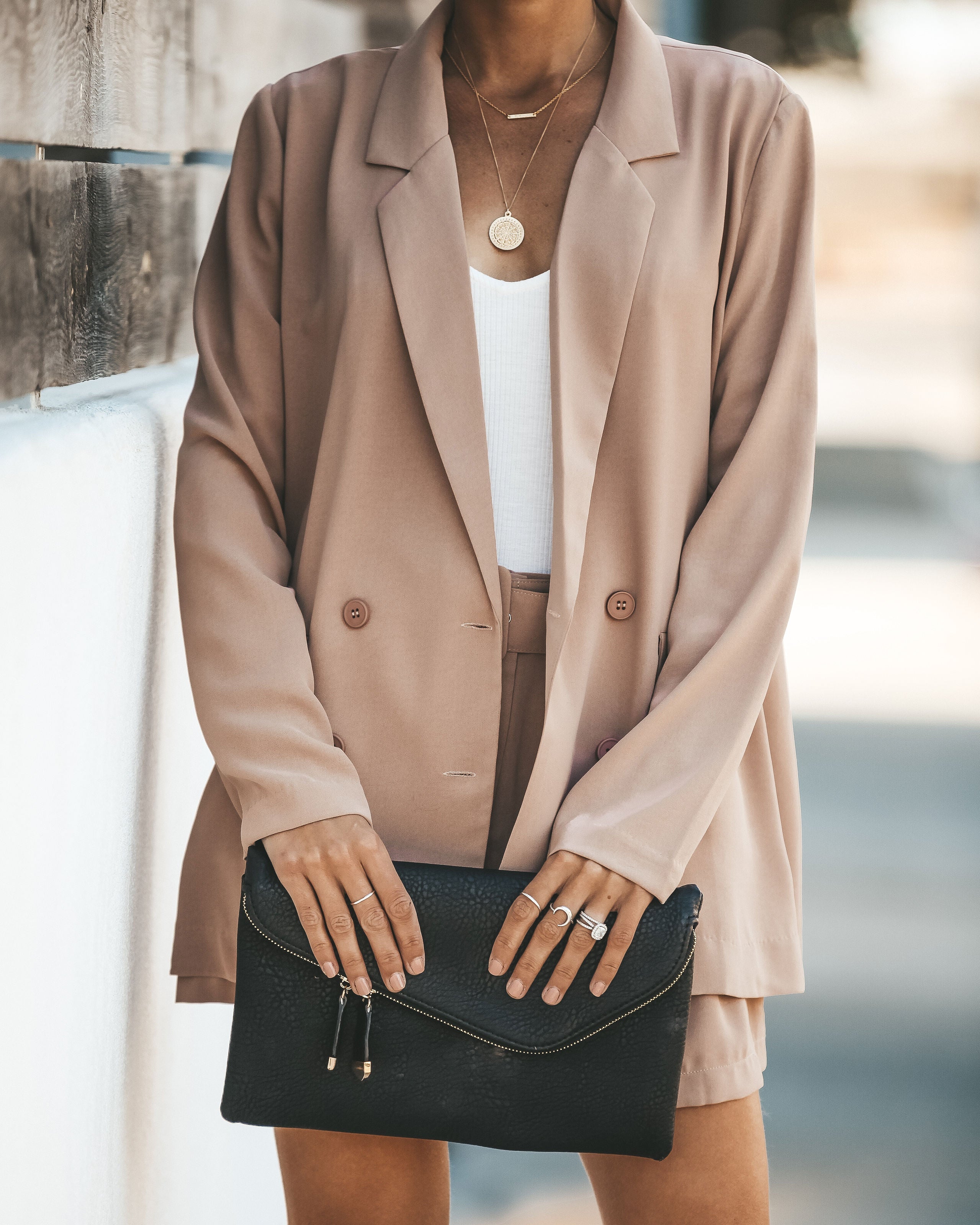 The fashion Gods have answered. dolls! Our matching Smith Pocketed Blazer is here! This tan. double breasted beauty has a notched lapel and two functional flap pockets. we're fawning over it! This is so lightweight and clean. pair it with or without the Smith Pocketed Belted Shorts ¡§C we hope you do! This is a perfect staple to every women's wardrobe! There are functional button closures so you can wear this open or closed. however you prefer. Take on the new year in this fab blazer for a work to weekend look. you can't go wrong! Styled with our Smith Pocketed Belted Shorts. Bomb Ribbed Bodysuit. Knox Necklace. The Buddha Wheel Necklace. Tyra Heel. and Stella Crossbody Envelope Zip Clutch.