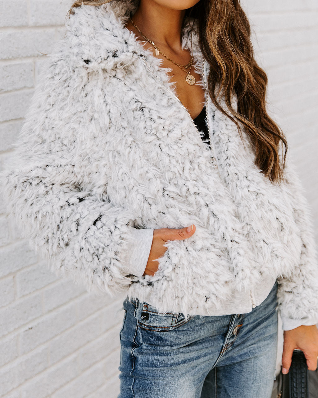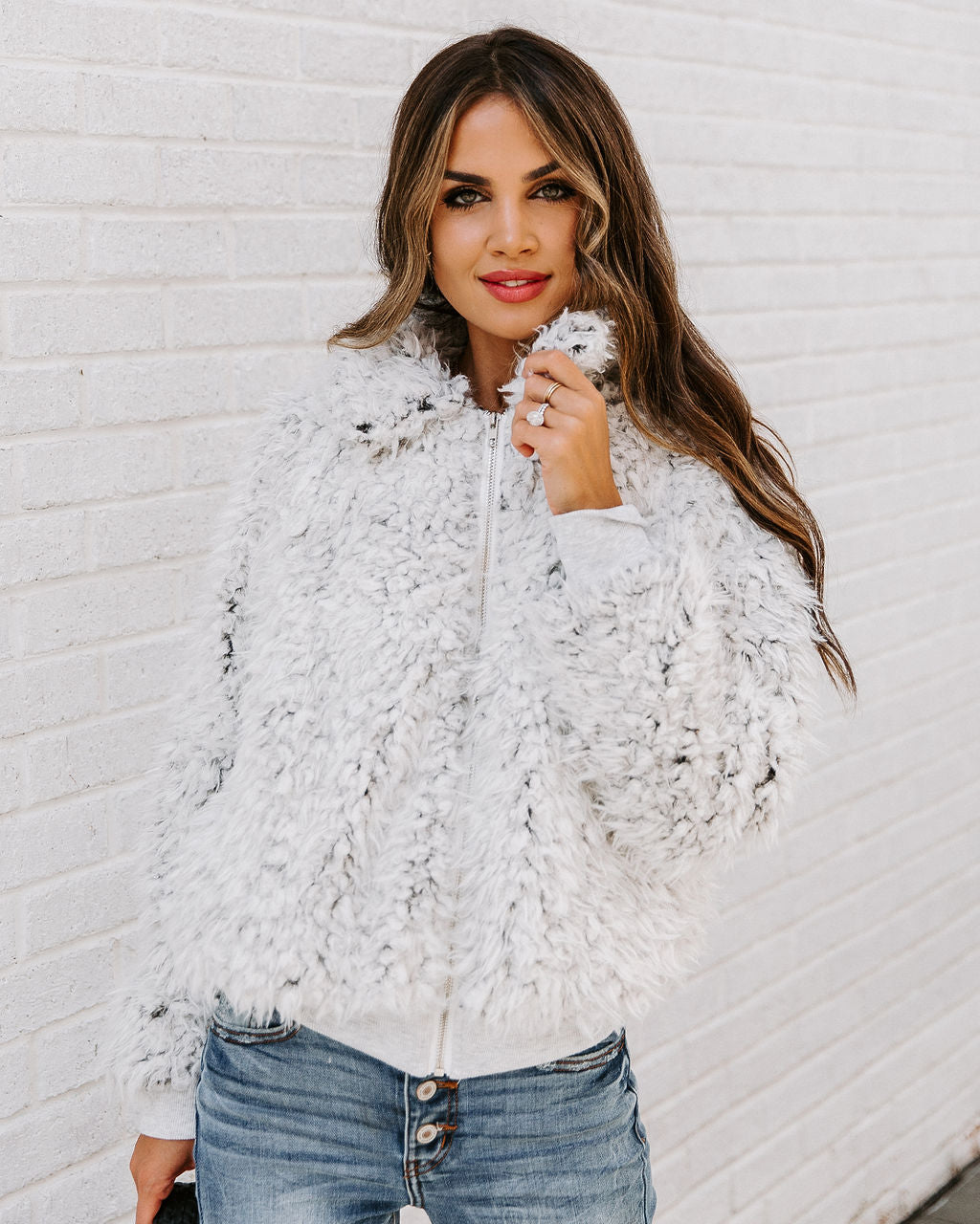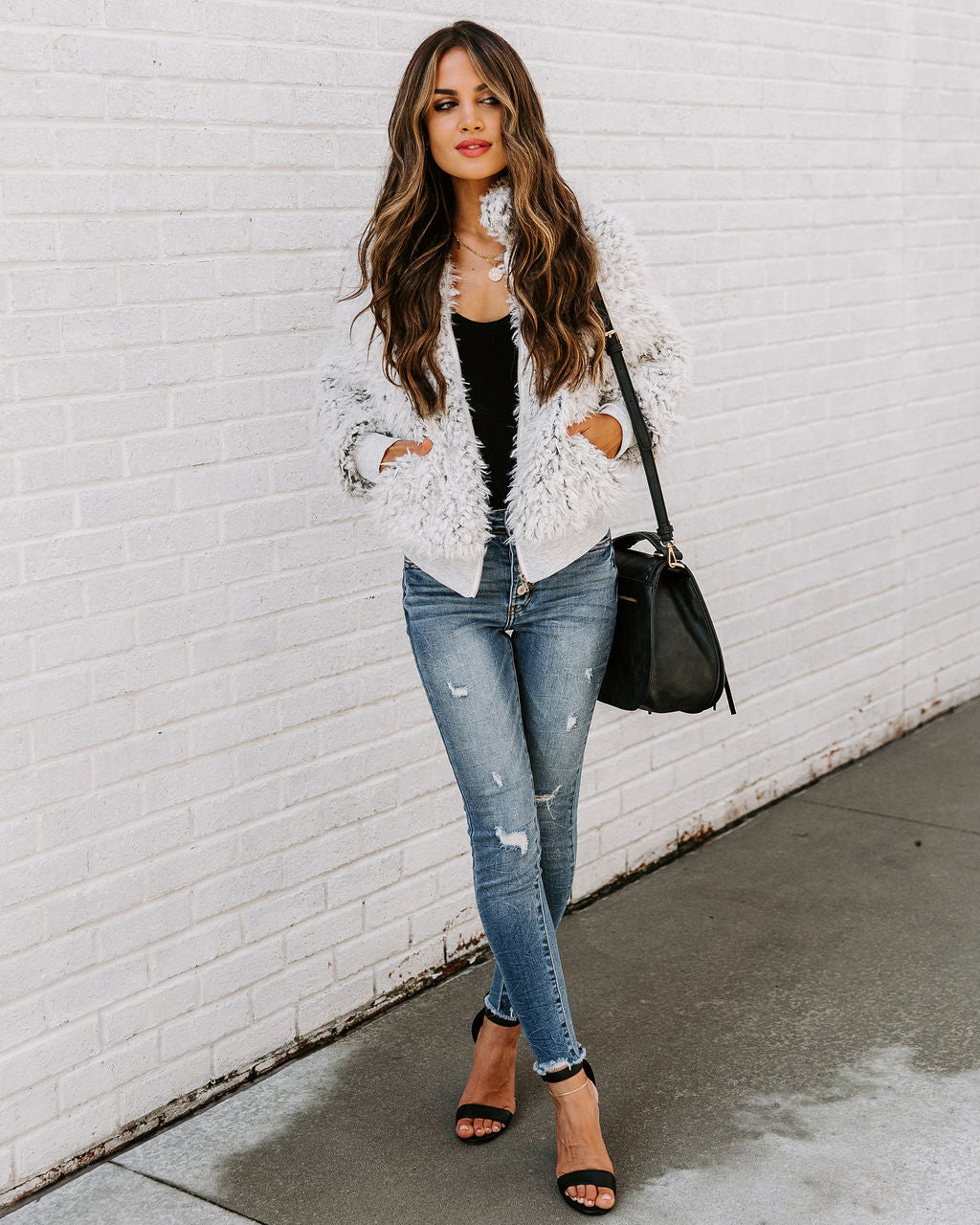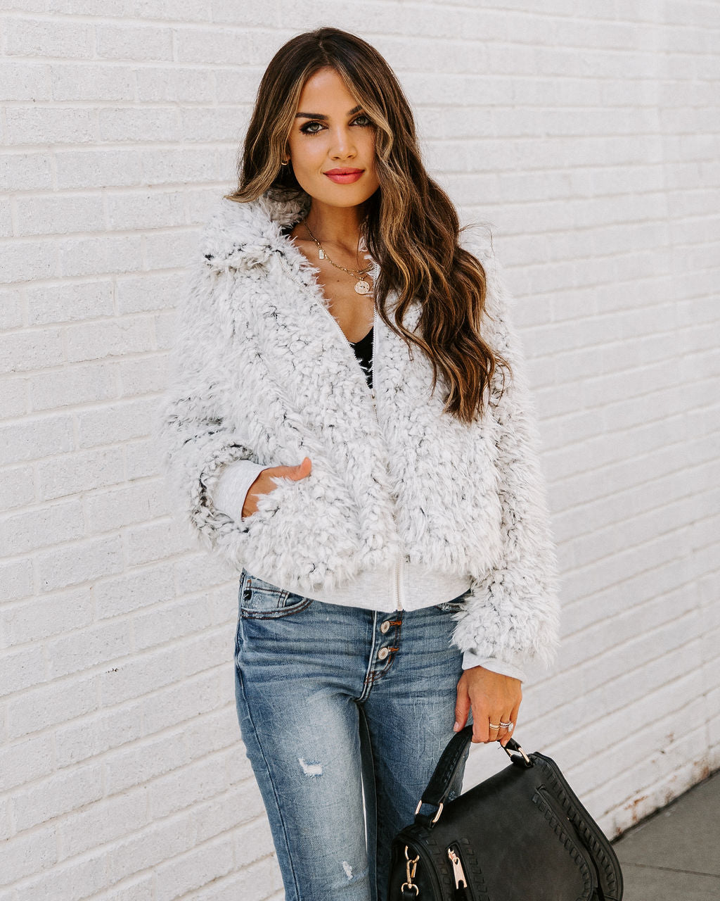 //Best Seller// We are obsessed with the beyond soft Snow Angel Pocketed Faux Fur Jacket! This white and black faux fur bomber features a true to size fit. high neckline and long sleeves with ribbed cuffs. A chic Fall + Winter must have to upgrade your look! Finished with a silver front zipper closure and full cotton lining. Styled with the Highland Bag. Tilley Frayed Ankle High Waisted Skinny. and Whimsy Heel.