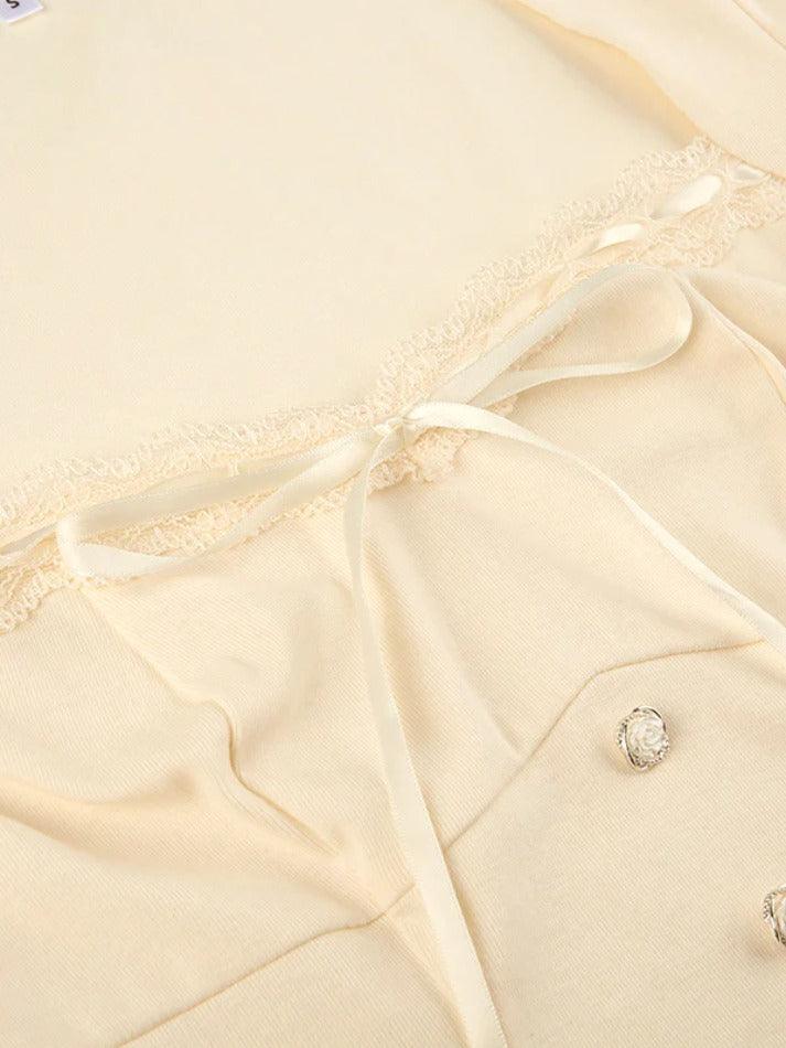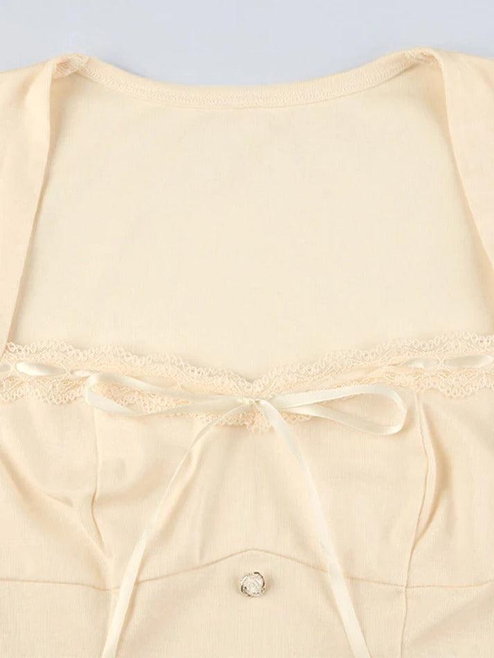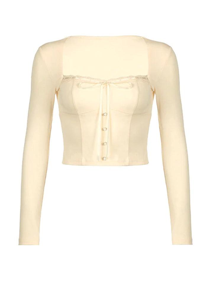 Square Neck Lace Splice Tie Front Long Sleeve Tee