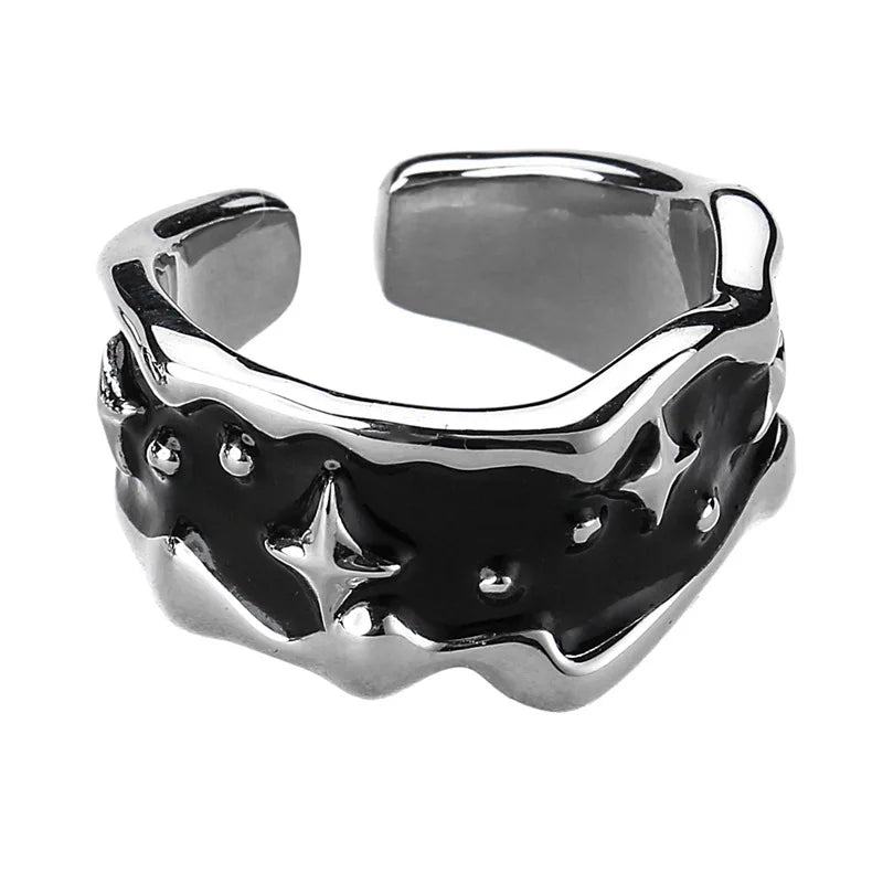 The *StarWave Punk Ring* could be a bold accessory featuring a fusion of edgy punk vibes with cosmic elements. like starry details or wave patterns.