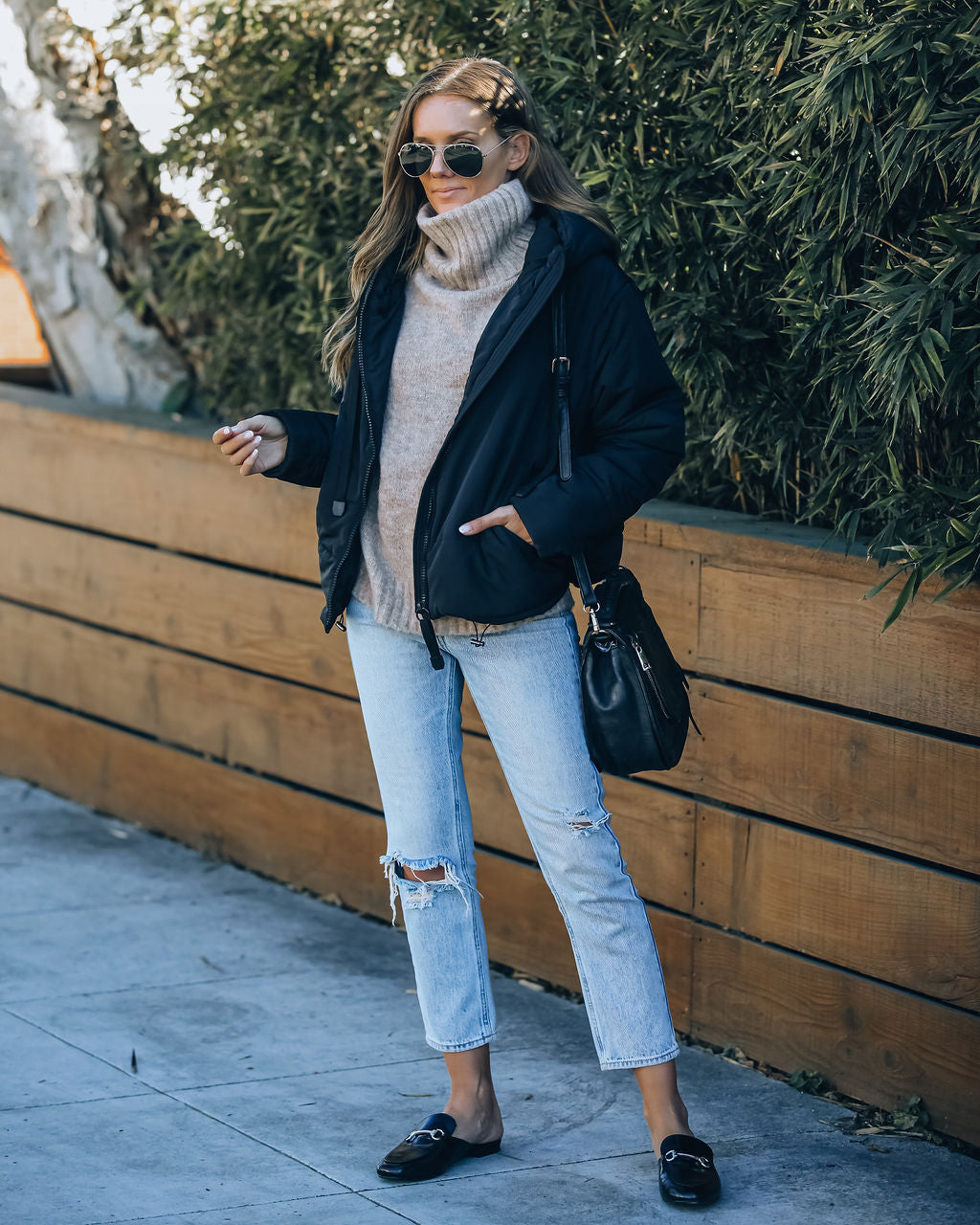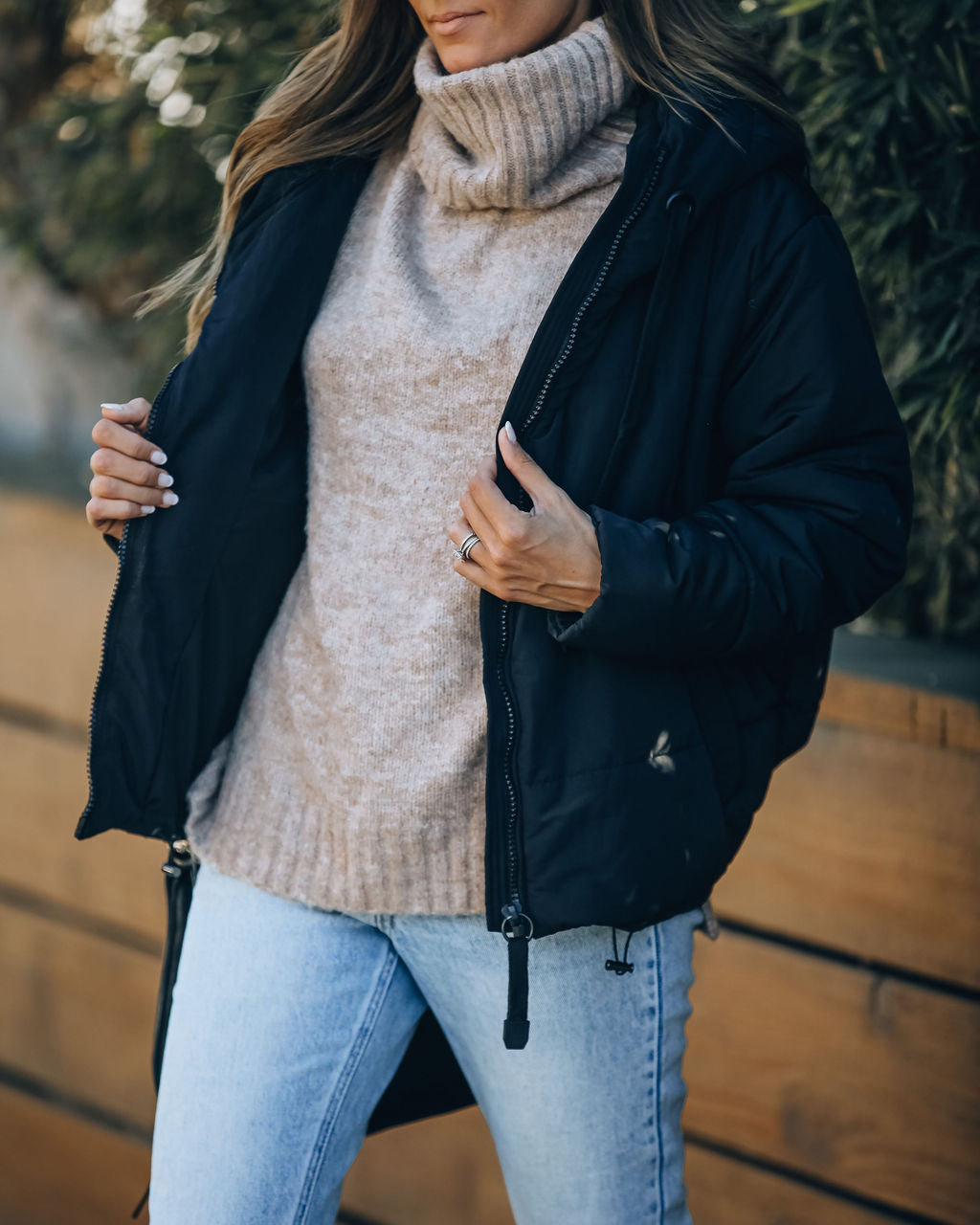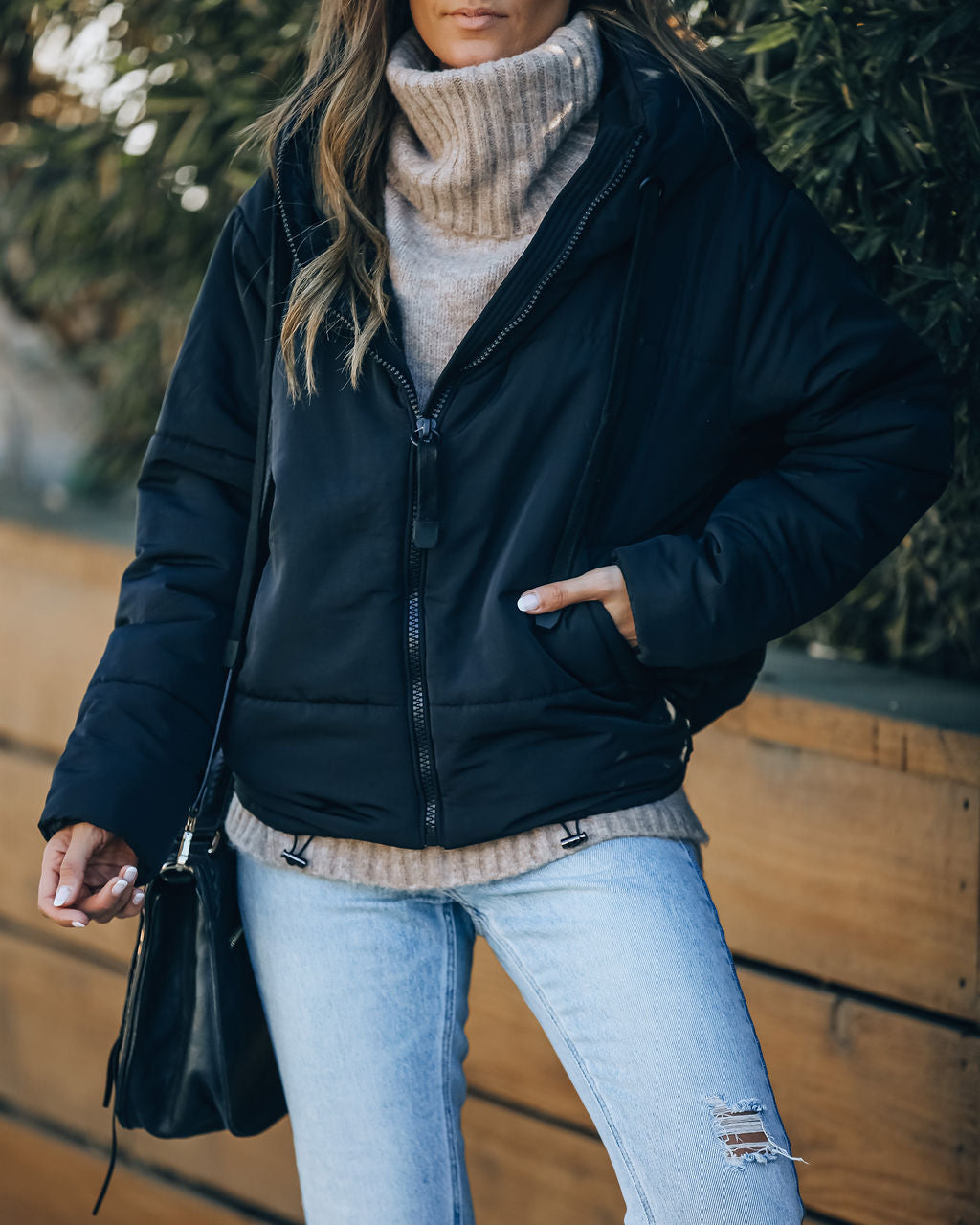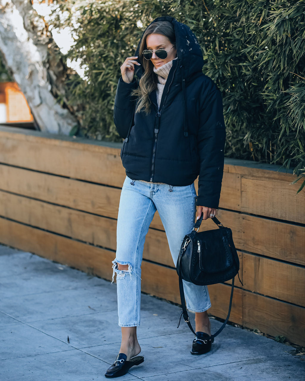 Our Stay Awhile Pocketed Hooded Puffer Jacket is the chicest way to elevate your Fall/ Winter outerwear! Crafted in a black puffer fabric. this relaxed fit jacket features a drawstring hood + hemline with long sleeves and side pockets. Adored for its full lining and front zipper closure. Styled with the Highland Bag. Henry Sweater. Kason Distressed High Rise Denim. and Cruise Croc Embossed Loafer Mule.