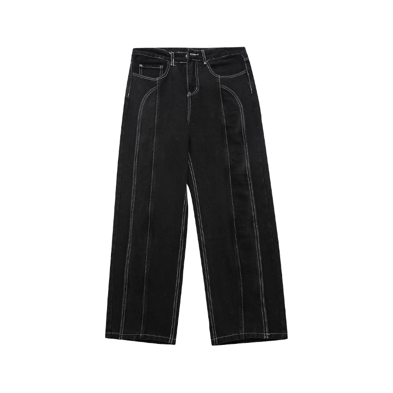 The Street Stitch Spliced Baggy Jeans by VONVEX are made from durable denim with a spliced design and street stitch details. Featuring a loose fit. straight style. mid-rise waist. and zipper fly closure. these full-length jeans blend comfort with a trendy look