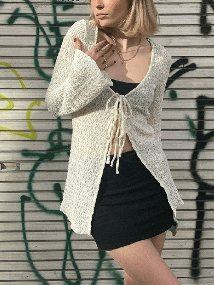 Style: Casual/Street/Y2K/Vintage/Sweet Fabric Content: Polyester Blend Fit Type: Regular fit Neckline: V Neck Sleeve Length: Long Sleeve Design: Features open front with adjustable tie strap fasten detailing.