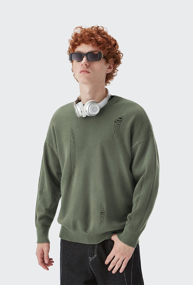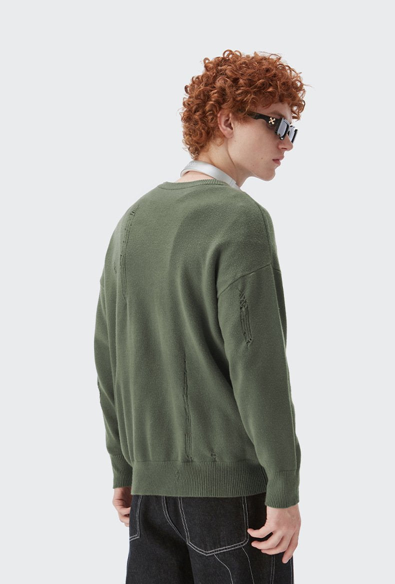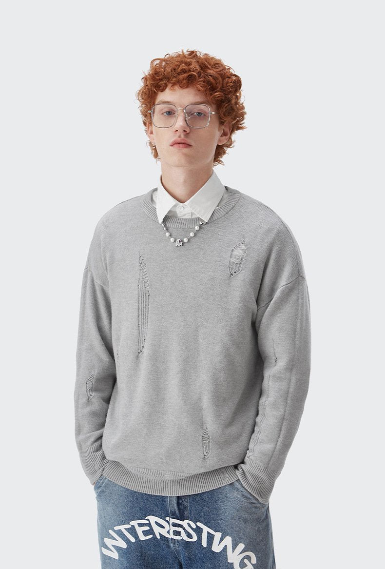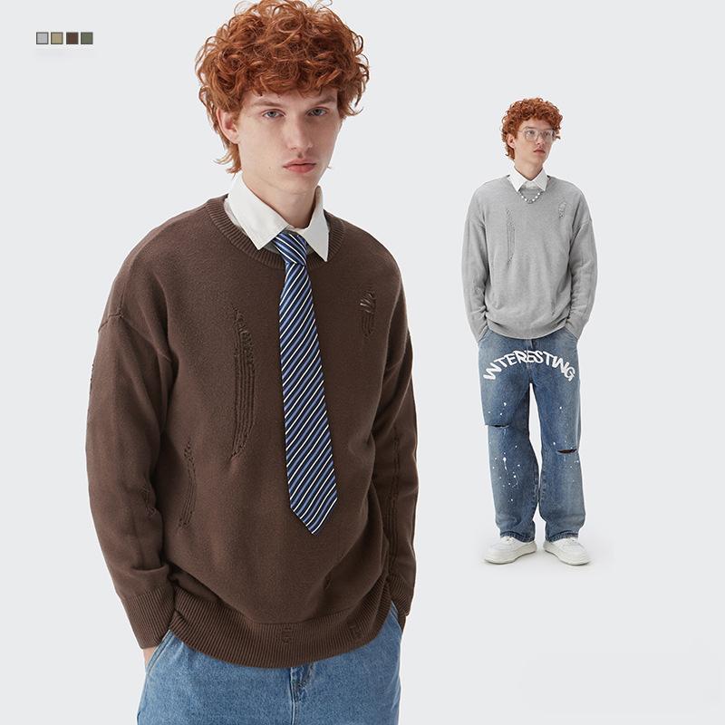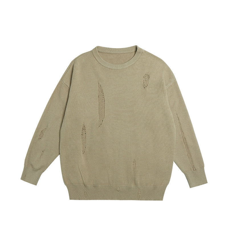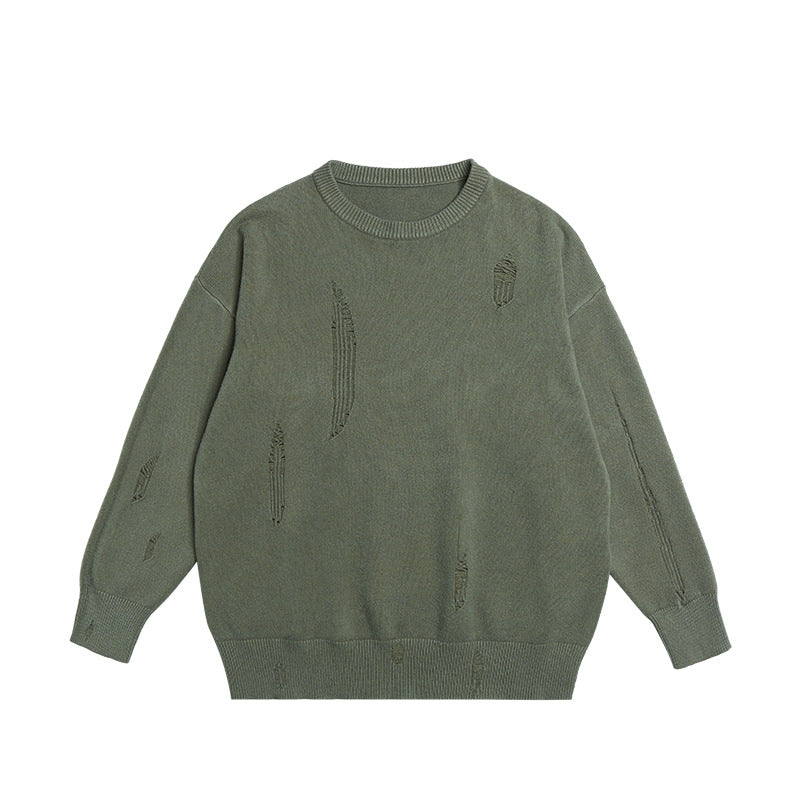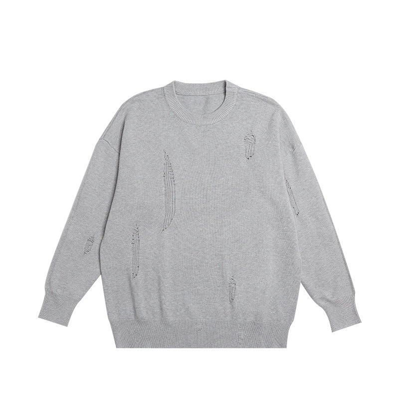 The Tattered Loose Sweater exudes a distressed. edgy look with its relaxed fit and worn-in texture. Perfect for adding a rugged. laid-back vibe to your casual outfits.