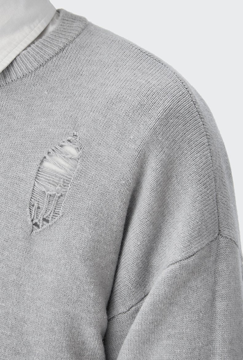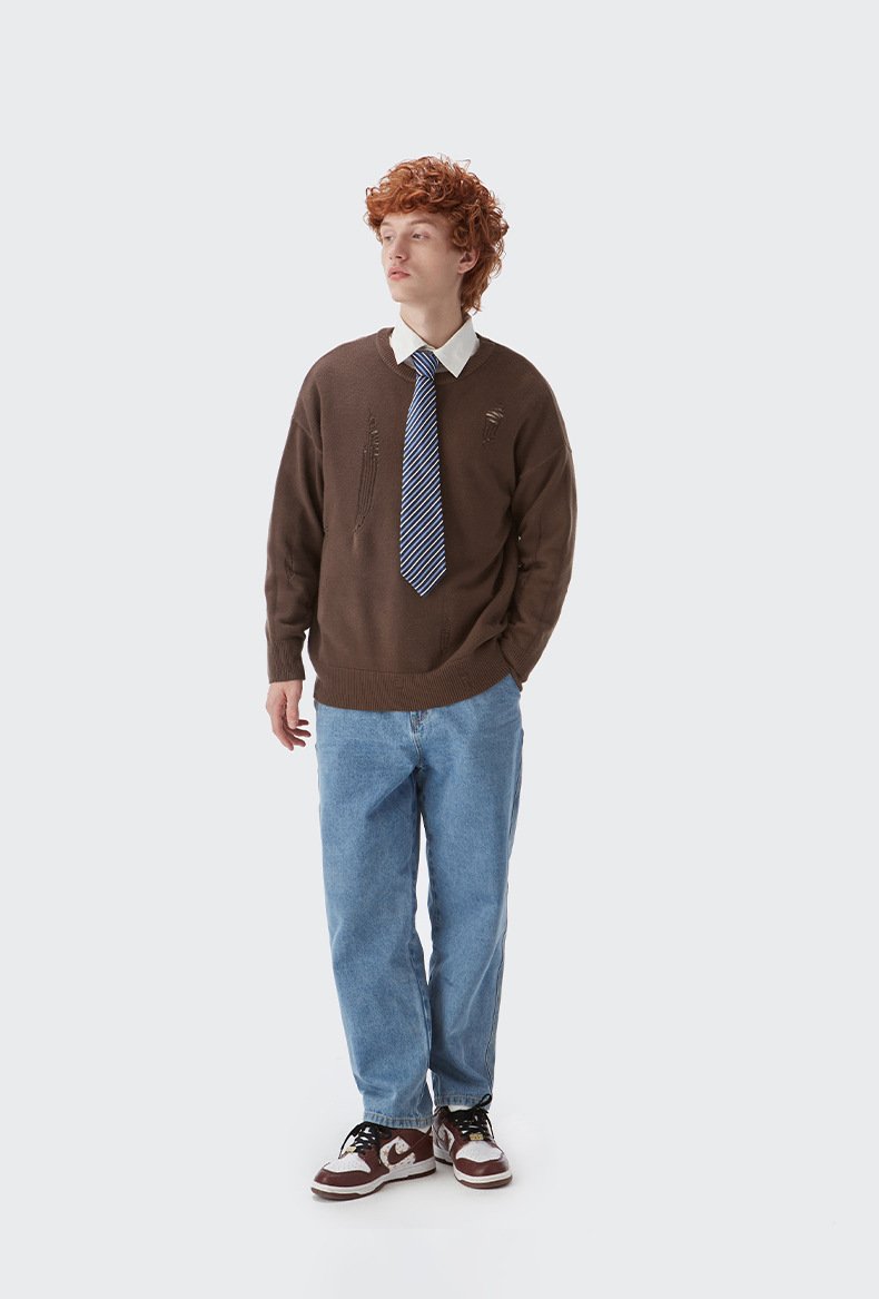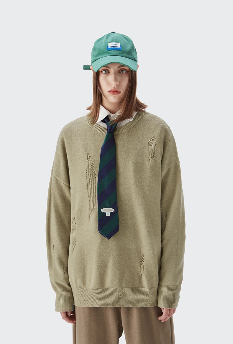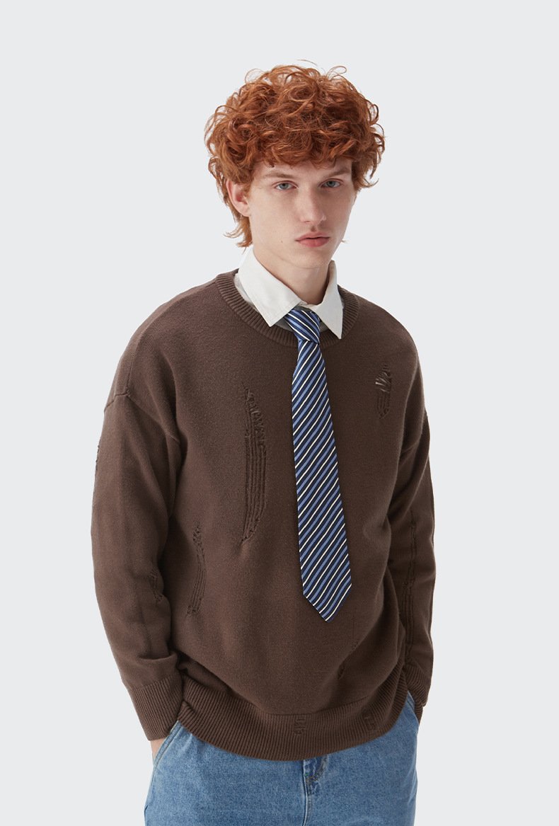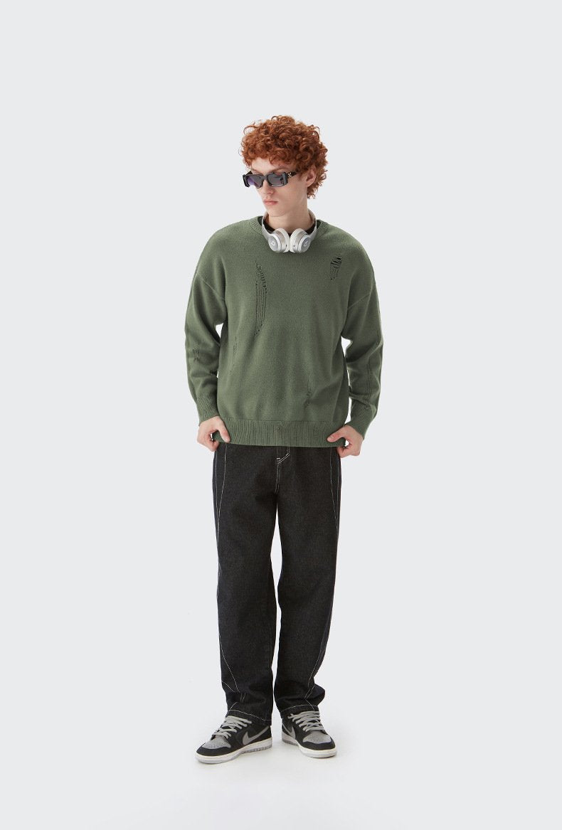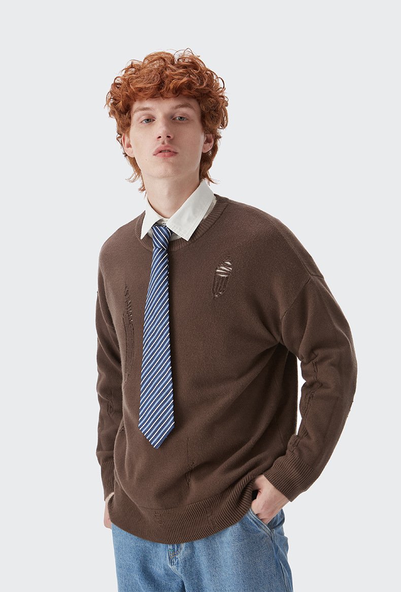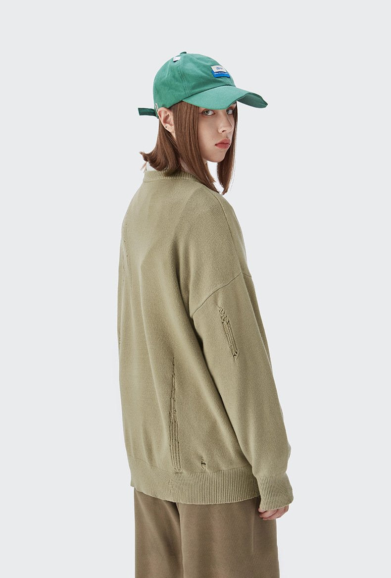 The Tattered Loose Sweater exudes a distressed. edgy look with its relaxed fit and worn-in texture. Perfect for adding a rugged. laid-back vibe to your casual outfits.
