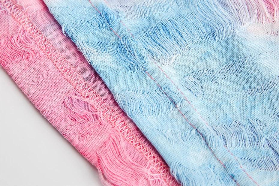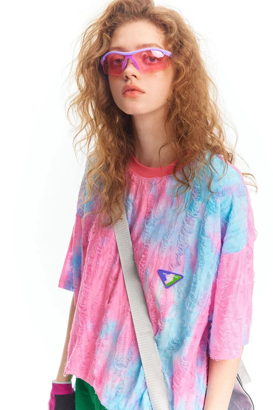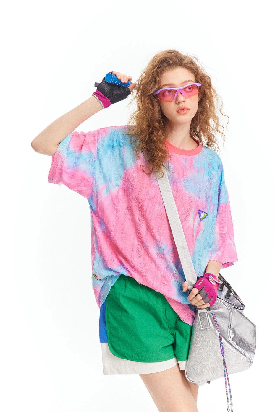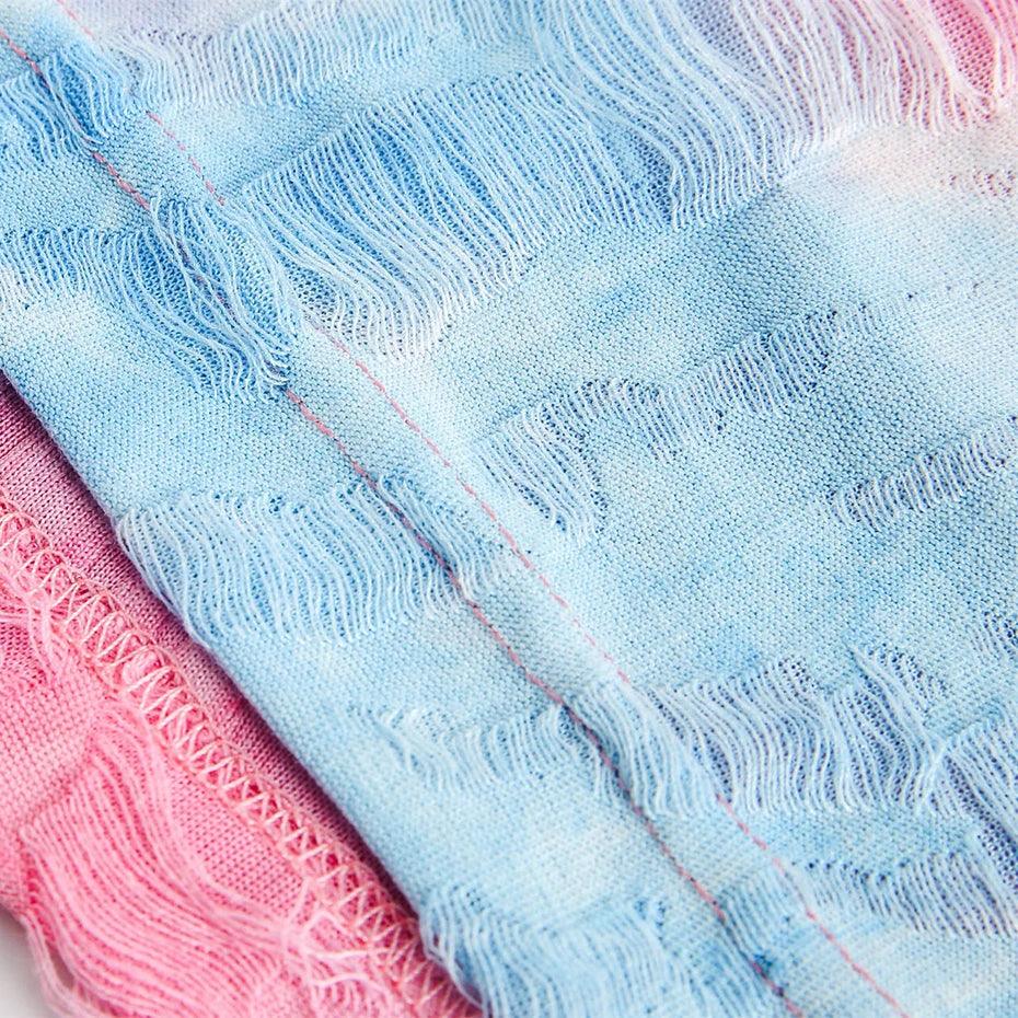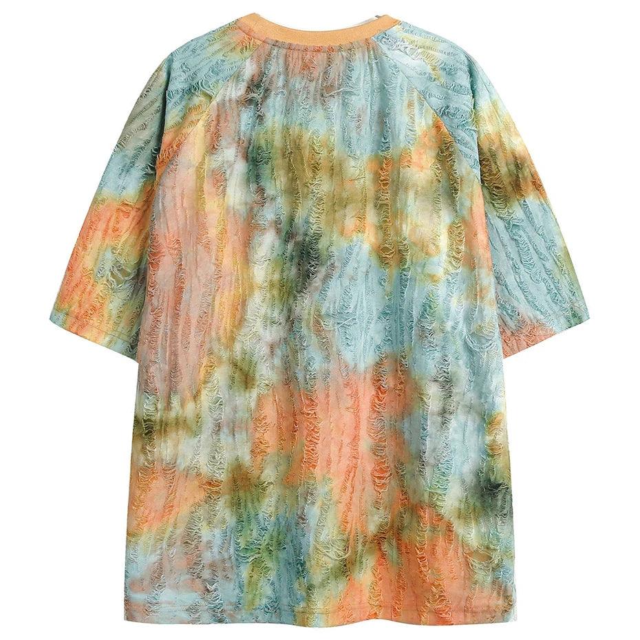Make a bold statement with Vonvex Clothing's Tie Dye Ripped Oversized T-Shirt. Crafted from soft cotton broadcloth. this O-neck tee features a vibrant tie-dye pattern and stylish rips. offering a trendy and relaxed fit that's perfect for any casual occasion.