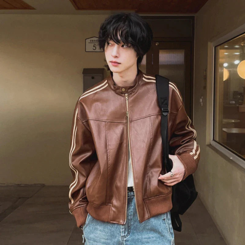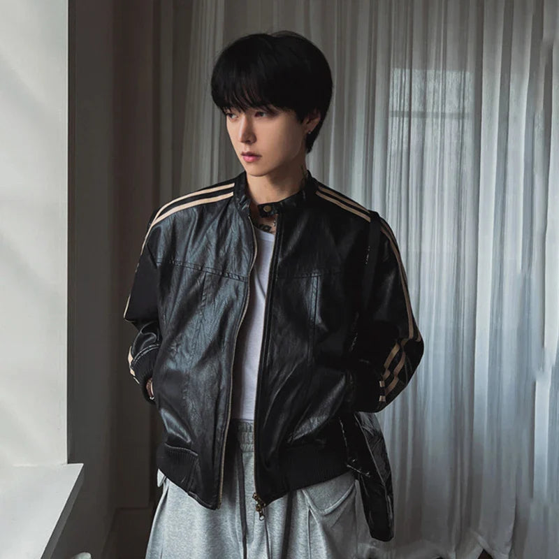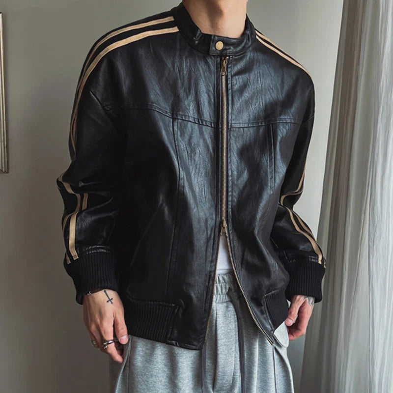 Urban Striped Shoulder Leather Jacket: Edgy and sleek. featuring bold shoulder stripes on premium leather for a modern. street-inspired look. Perfect for standing out in style.
