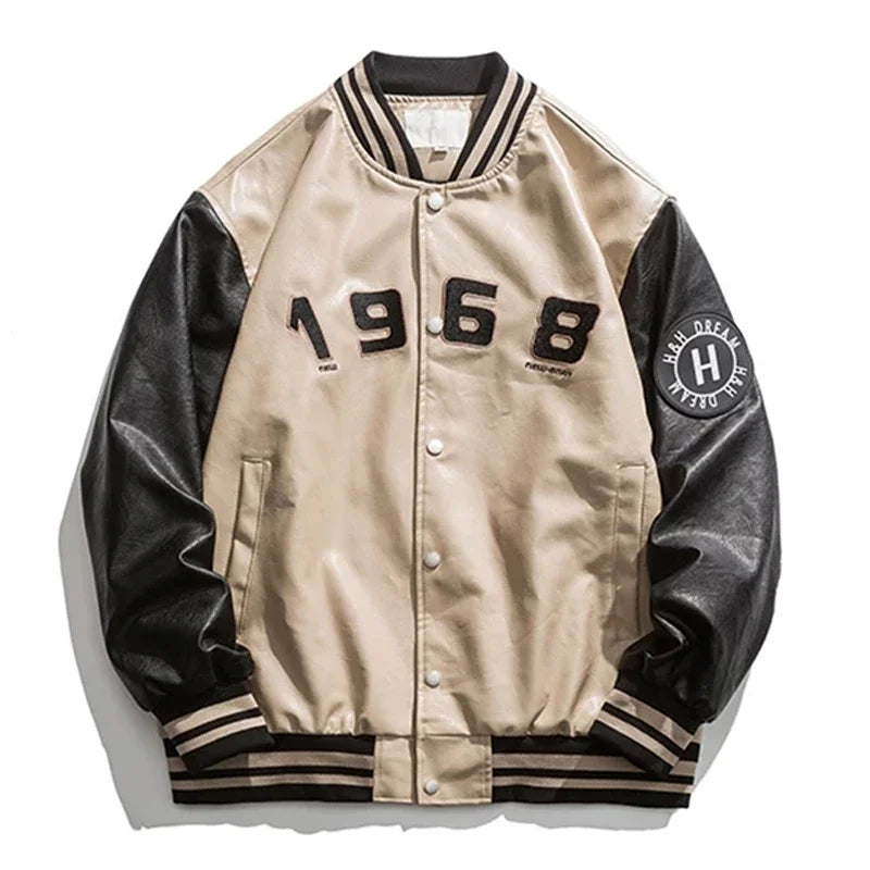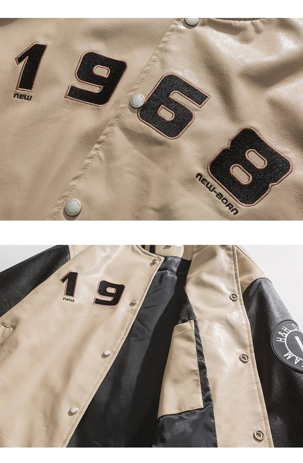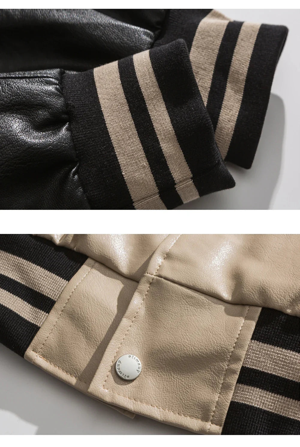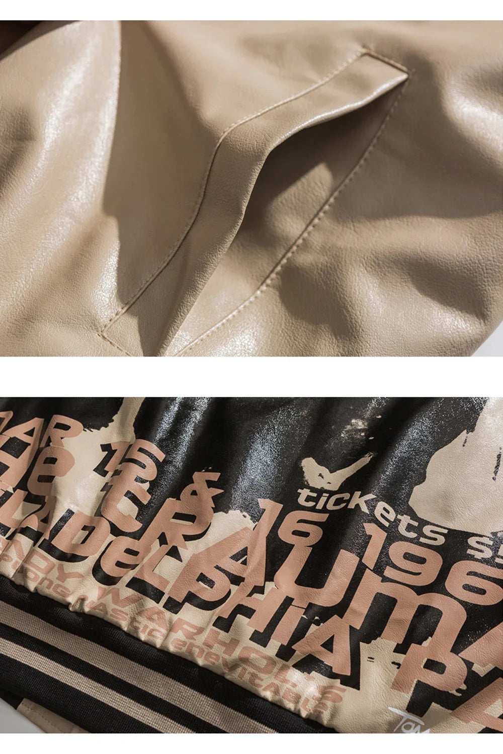 The Varsity Portrait PU Leather Bomber Jacket combines classic varsity style with sleek PU leather and bold portrait details. creating a statement piece that blends retro and modern streetwear vibes.