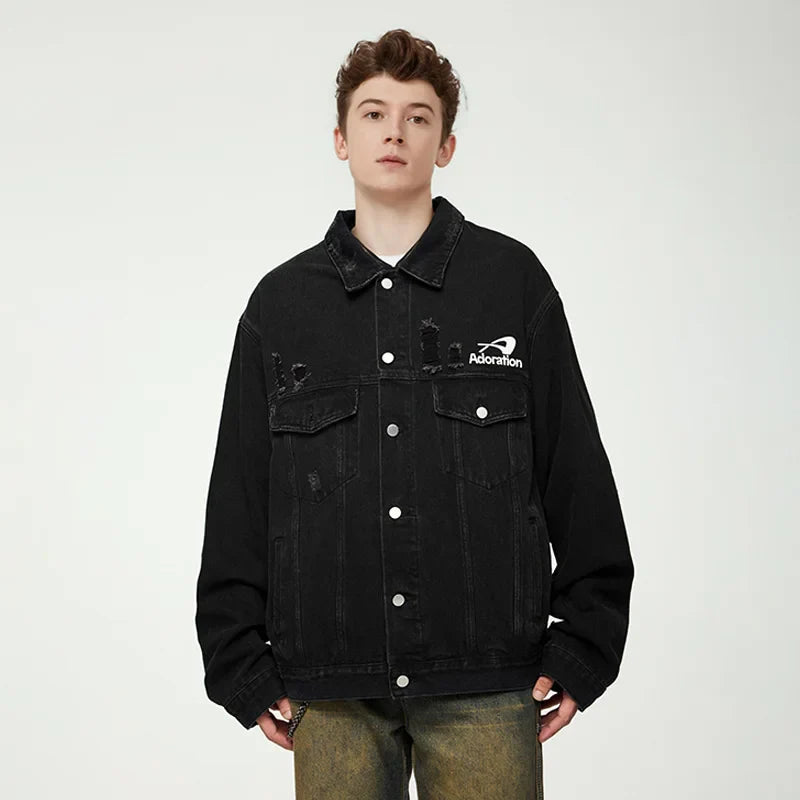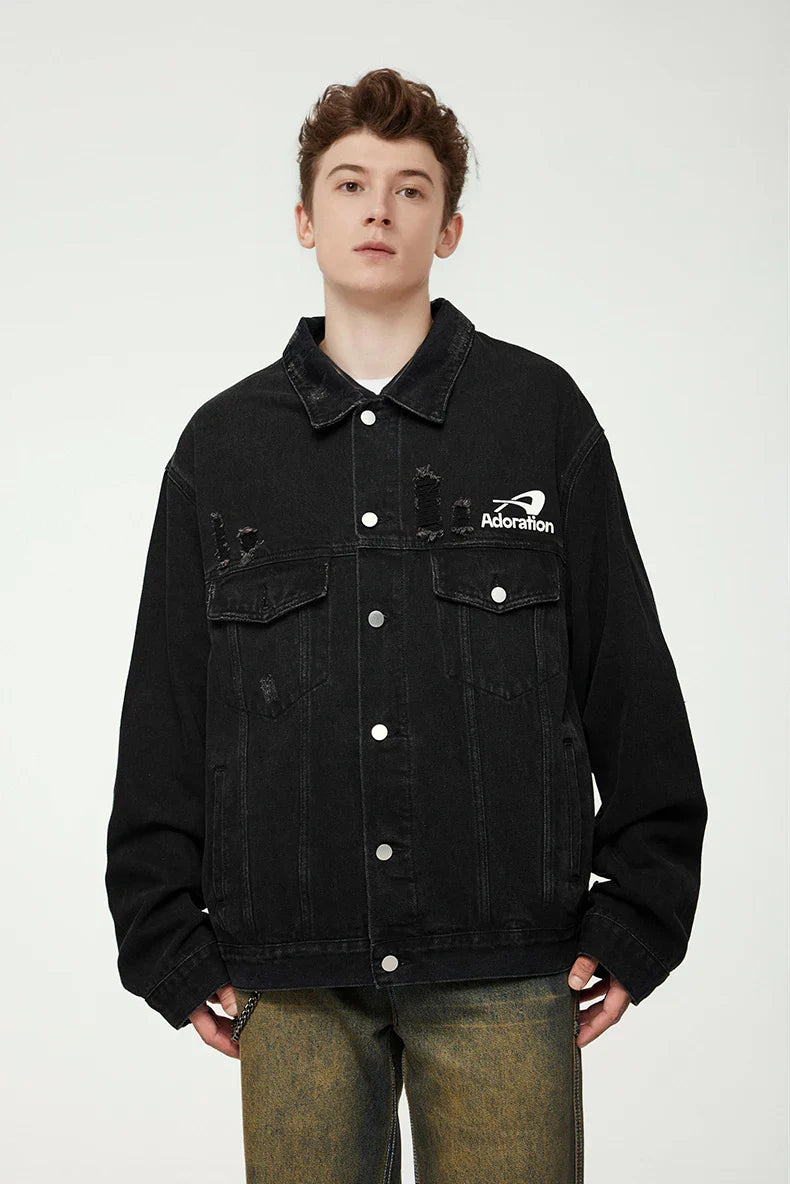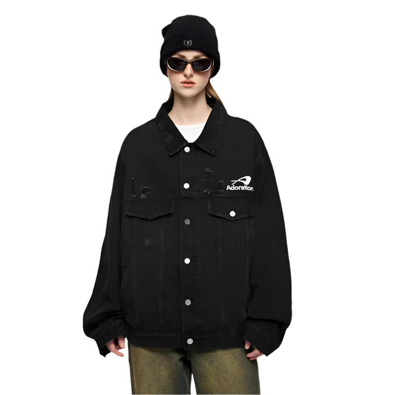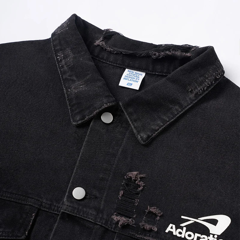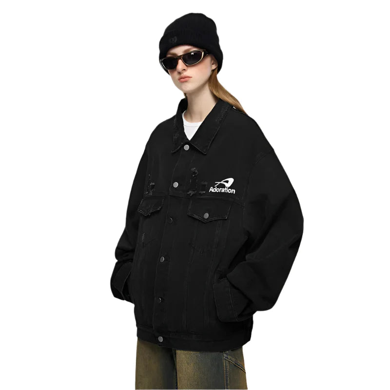 "Versatile Distressed Denim Jacket: Effortlessly cool. featuring a loose fit with distressed details for a bold. casual look."