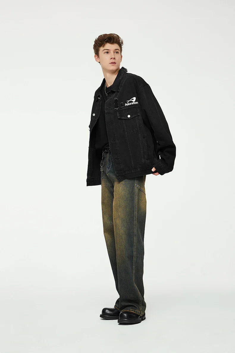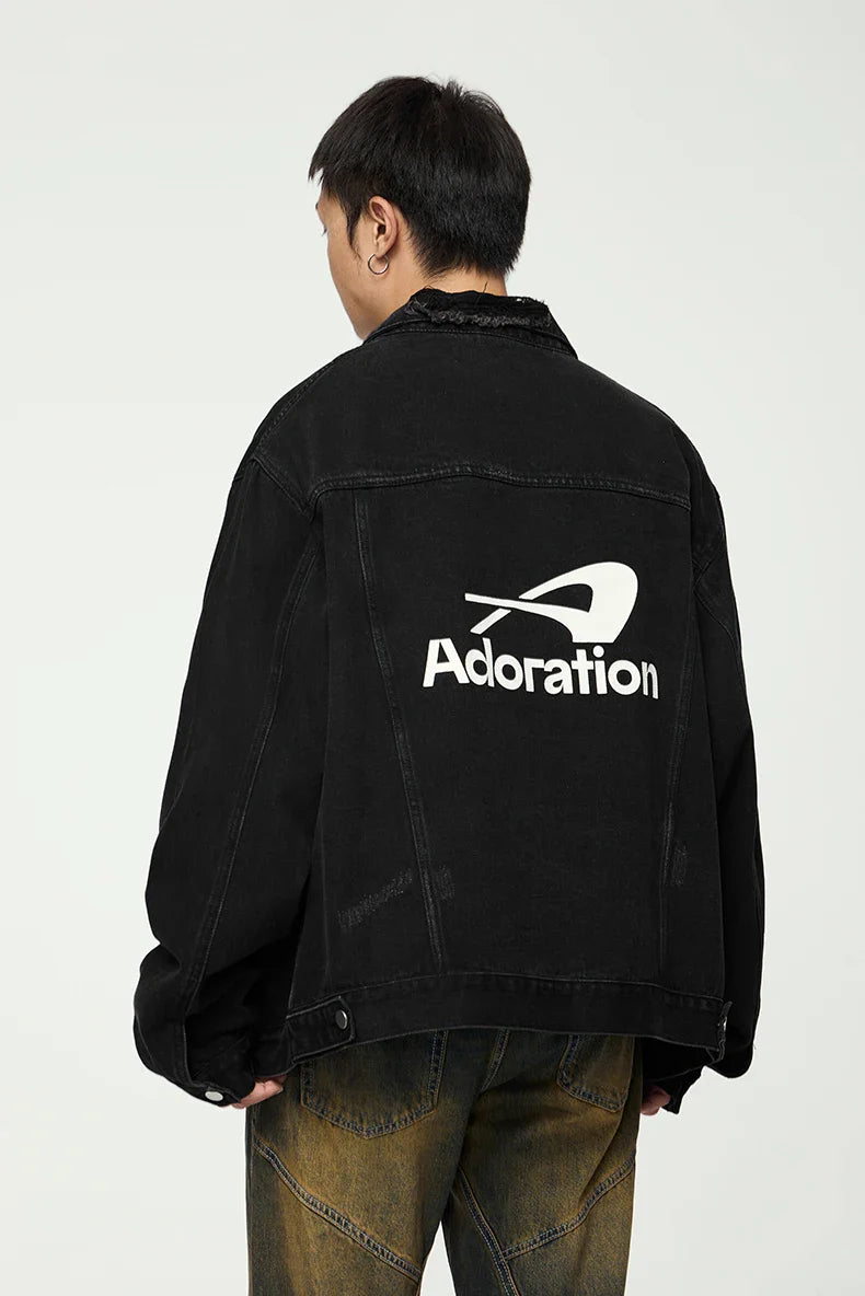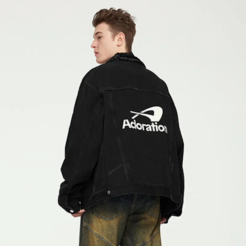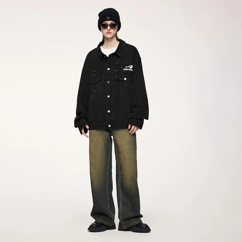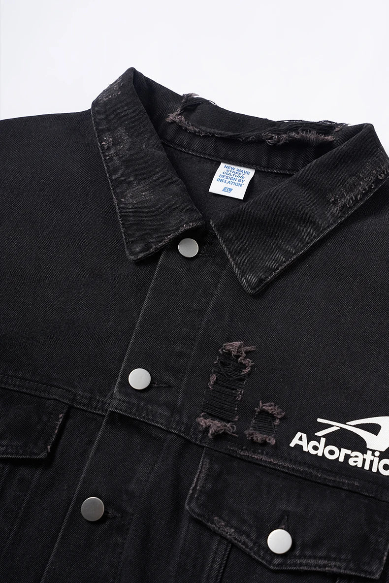 "Versatile Distressed Denim Jacket: Effortlessly cool. featuring a loose fit with distressed details for a bold. casual look."