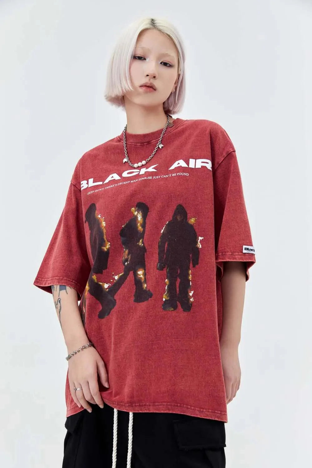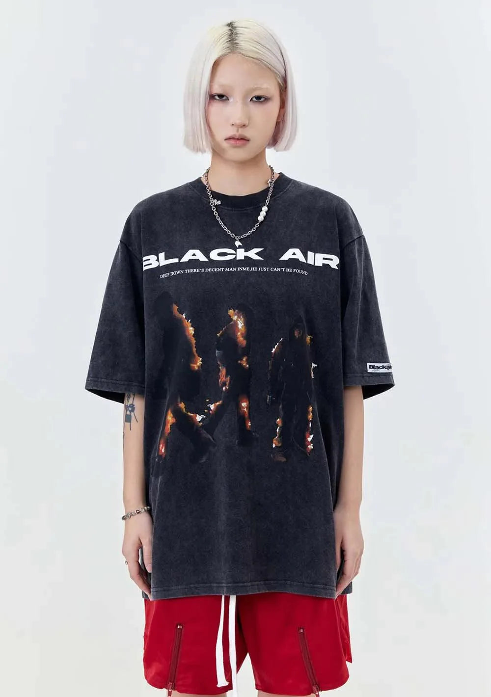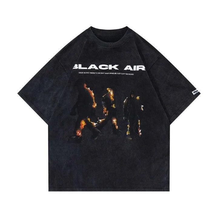 "Elevate your style with the Vintage BLACK AIR Flame T-Shirt. blending vintage charm with gothic flair. Crafted from cotton broadcloth. featuring an O-Neck collar and flame print. Perfect for adding a touch of edgy style to your wardrobe."