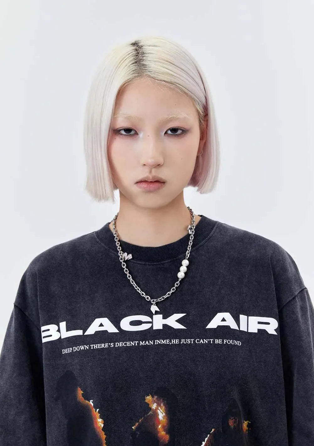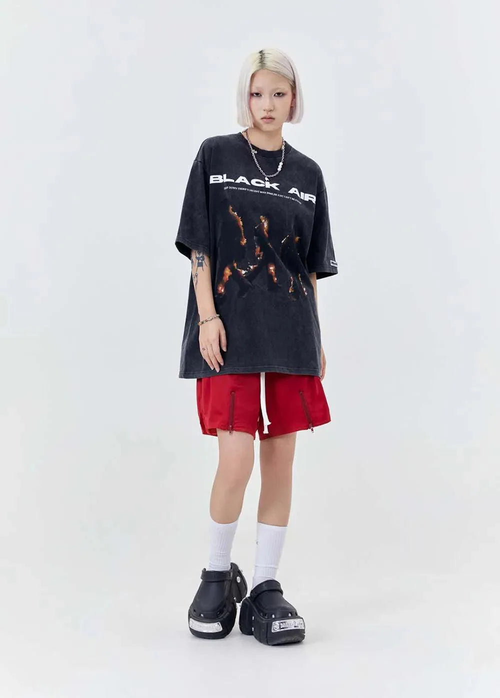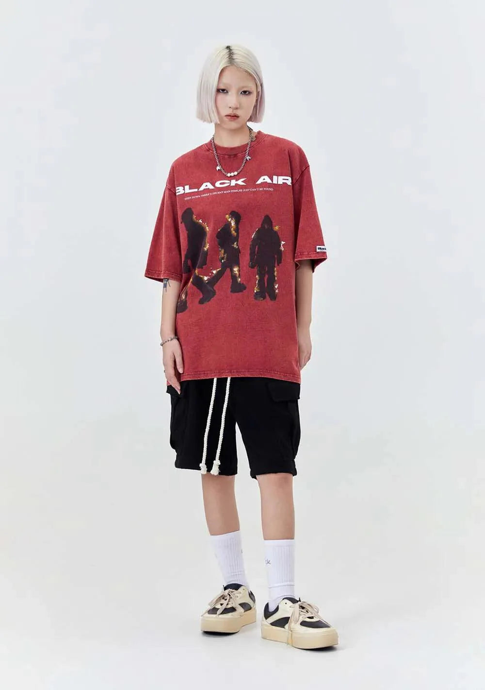 "Elevate your style with the Vintage BLACK AIR Flame T-Shirt. blending vintage charm with gothic flair. Crafted from cotton broadcloth. featuring an O-Neck collar and flame print. Perfect for adding a touch of edgy style to your wardrobe."