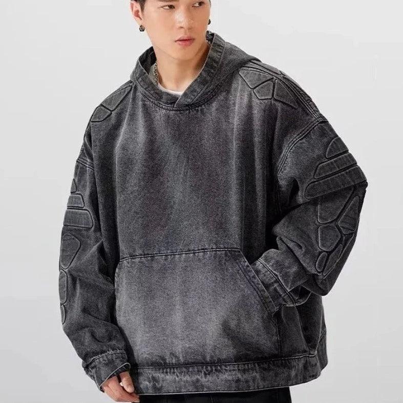 Elevate your street style with our Vintage Washed Denim Hoodie. Made from cotton. featuring pockets and a solid pattern for a vintage look.